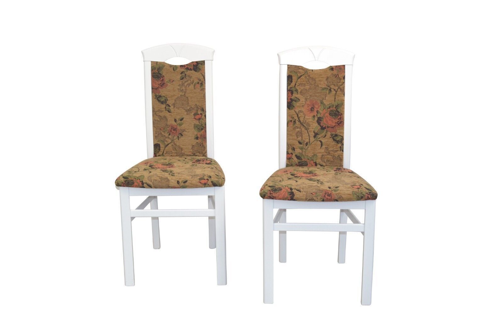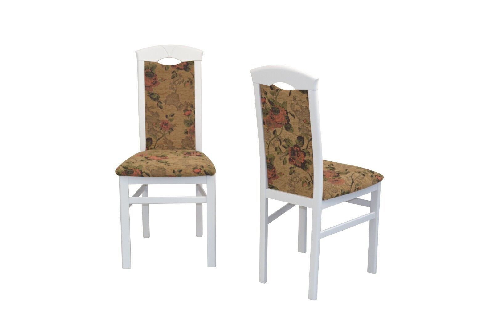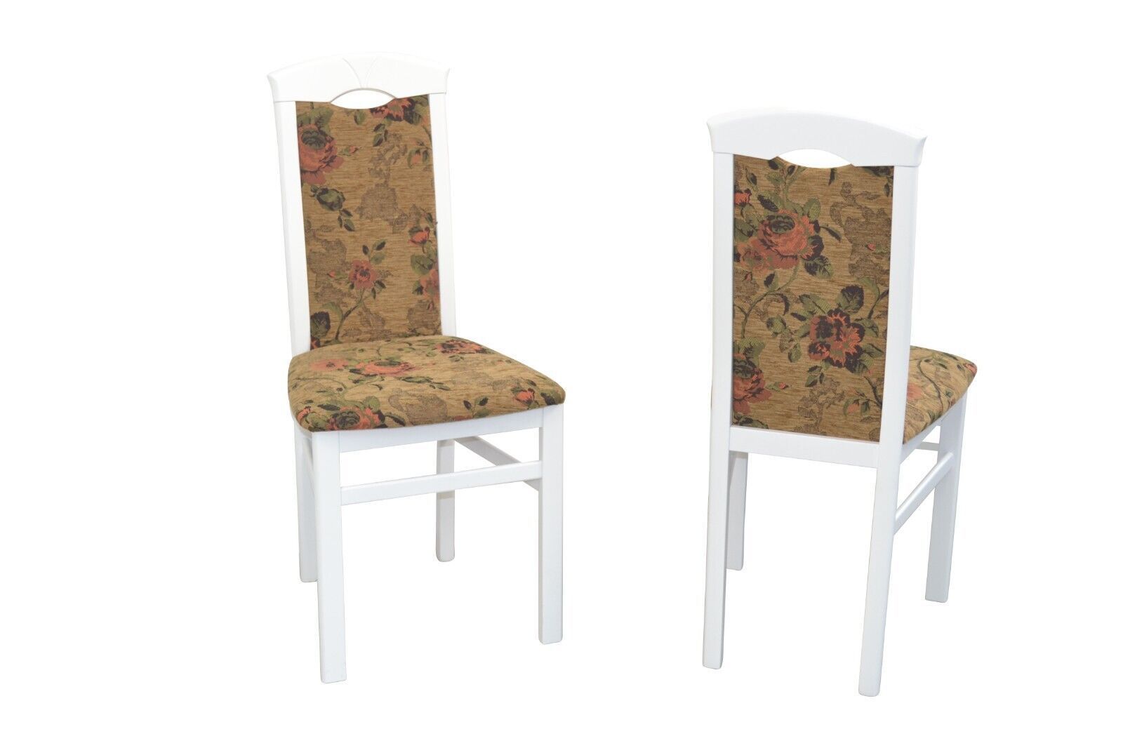 2er Set Stühle massivholz Buche weiß Gestell aus Massivholz Buche, gebeizt und lackiert. Sitz und Rücken sind schaumstoffgepolstert und mit einem Blumen-Stoffbezug, 100% Polyester, bezogen. Rücken mit eingearbeiteter Griffmulde. Die Stühle werden aufgebaut geliefert. Stoff braun 100% Polyester Licht