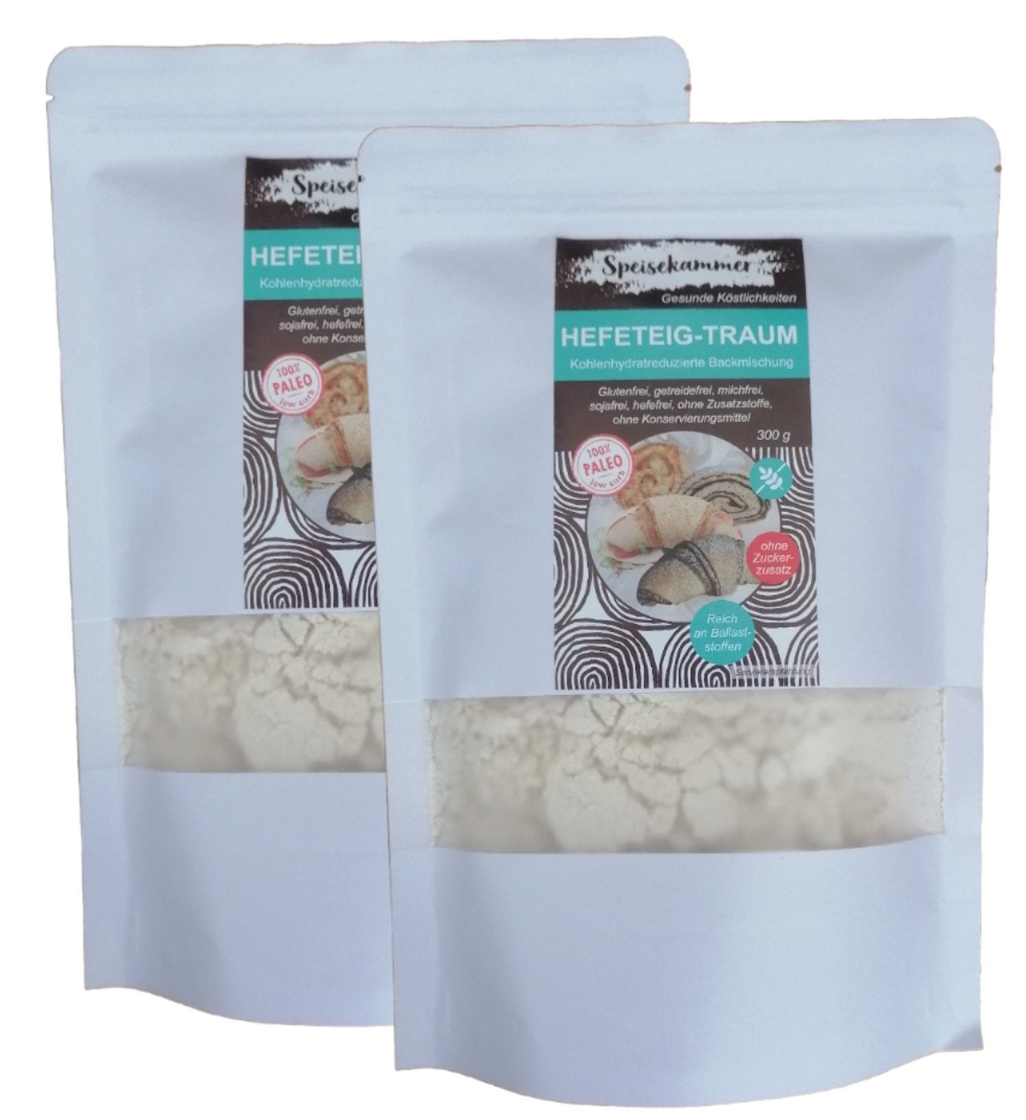 2 x 300g Speisekammer Hefeteig-Traum Universal Backmischung (glutenfrei, getreidefrei, milchfrei, sojafrei, hefefrei, maisfrei, Paleo) im wiederschließbaren Standbeutel D ieser Teig kann sehr vielseitig verwendet werden, wie zum Beispiel für Ihr Lieblingsgebäck (salzig oder süß), Kuchen, Plätzchen,