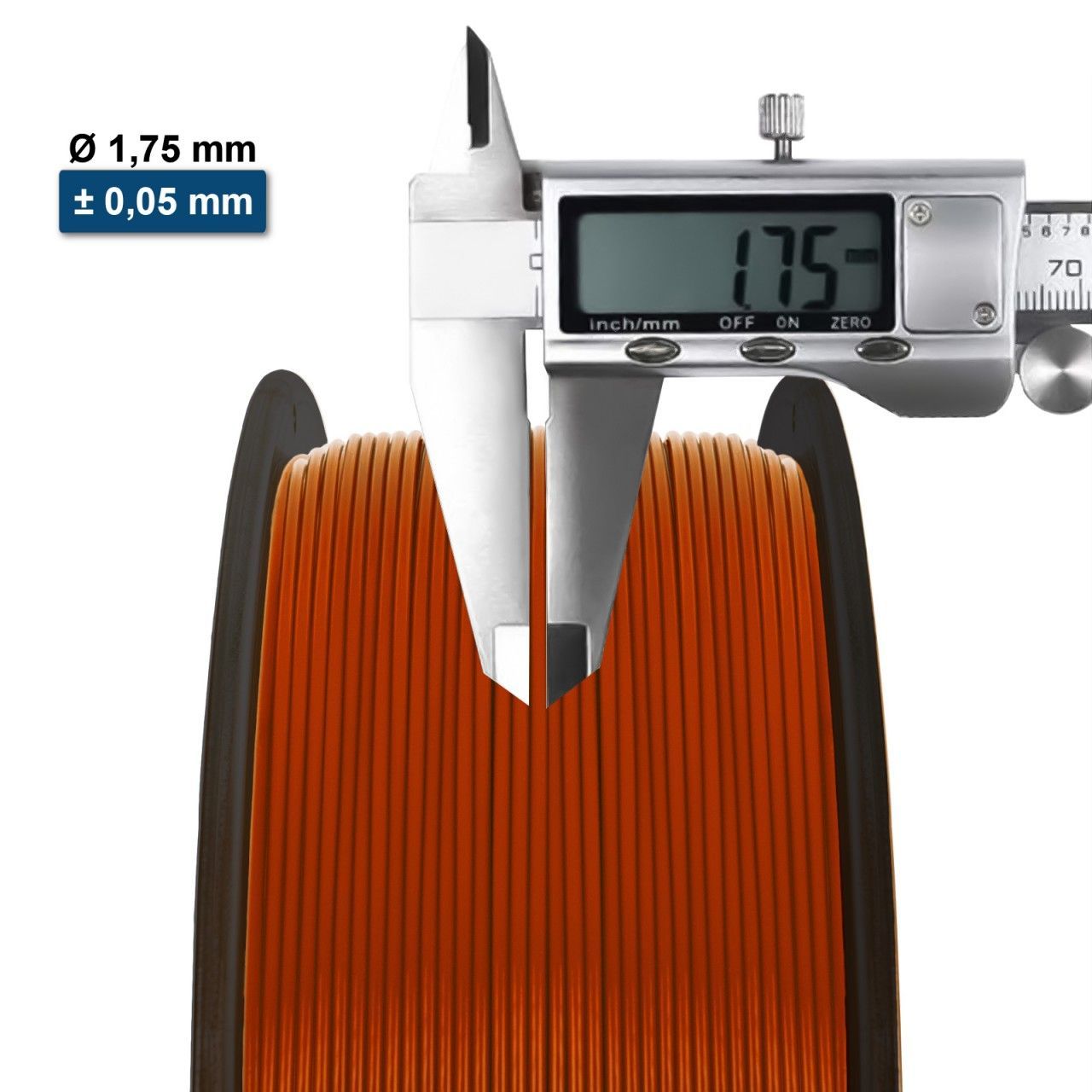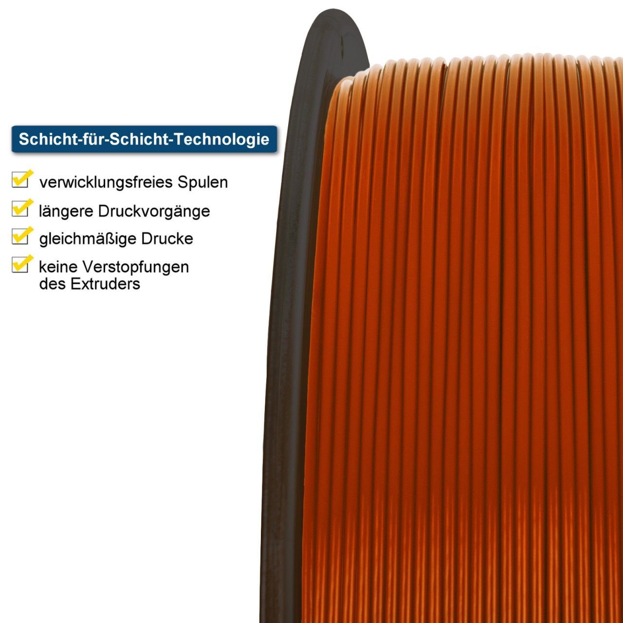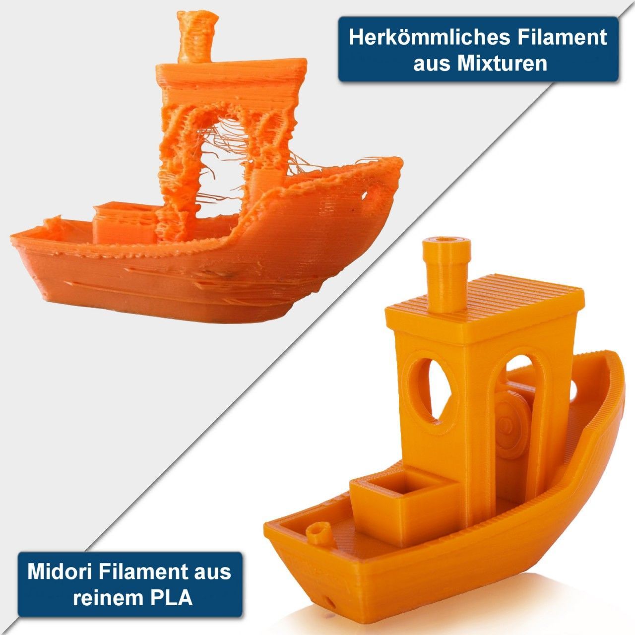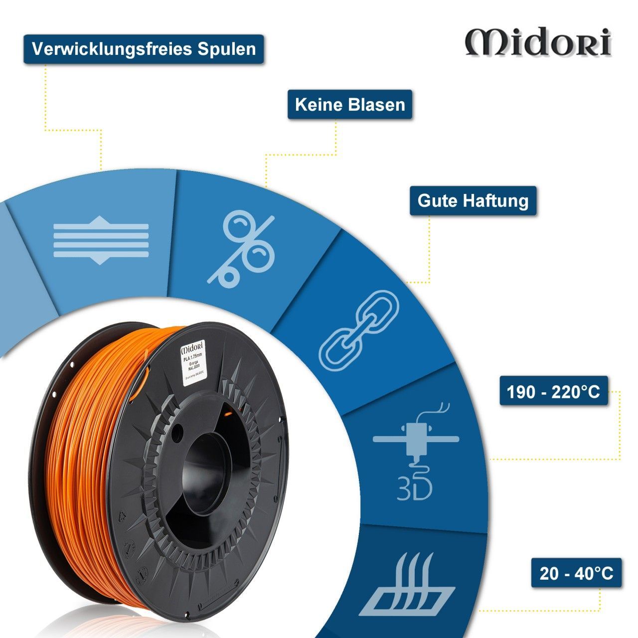 2 x MIDORI® 3D Drucker 1,75mm PLA Filament 1kg Spule Rolle Premium Orange RAL2000 Midori Qualitätsfilamente Wir haben es mit unseren Midori Filamenten zur Aufgabe gemacht Ihnen ein qualitativ hochwertiges Filament und Sintermaterial anzubieten, das sich deutlich in den Eigenschaften der Rundheit, Maßhaltigkeit und Farbechtheit vom Markt abhebt, denn nichts ist bedauerlicher, als wenn ein Druckvorgang nach einigen Stunden Laufzeit aufgrund von schlechtem Material abbricht, oder sich Farben nicht reproduzierbar abbilden lassen. Qualitätsware für Qualitätsdrucke Unsere Midori 3D-Filamente zeichnen sich durch eine sauber gewickelte Spule, eine perfekte Rundheit, sowie umfassende Kompatibilität mit verschiedenen FDM-3D-Druckern und -Stiften aus. Somit profitieren Sie mit unseren Filamenten von reibungslosen Drucksitzungen, sowie hervorragenden Druckresultaten. Hervorragende Ergebnisse dank reinem PLA Unsere Midori PLA 3D-Filamente bestehen im Unterschied zu herkömmlichen PLA Konkurrenzprodukten aus reiner PLA (Polylactic Acid/Polymilchsäure). Die reine PLA hat gegenüber herkömmlichen Mixturen den Vorteil einer besseren Formgebung ohne Blasenbildung, Verstopfen oder Verziehen. Somit werden Ihnen glatte Ausdrucke mit hervorragender Schichthaftung und hoher Steifigkeit ermöglicht. Verwicklungsfreies Spulen für glatte Druckabläufe Die hochwertigen Midori 3D-Filamente bewerkstelligen dank ihrer Schicht-für-Schicht-Technologie ein verwicklungsfreies Spulen und saubere Windungen, sodass längere Drucke problemlos ohne Verknotungen, Kreuzungen oder Überlappungen bewältigt werden können. Dadurch werden nicht nur extrem gleichmäßige Drucke sichergestellt, sondern auch mögliche Verstopfungen im Extruder verhindert. Konstanter Durchmesser in jedem Zentimeter Mit unseren 1,75 mm PLA 3D-Filamenten setzen wir auf höchste Präzision im gesamten Produktionsprozess. Die Herstellung der Filamente erfolgt unter strengsten Prüfungsmechanismen, sodass der Durchmesser der hochwertigen Filamente in jedem Zentimeter eine Toleranz von nur +/- 0,05 mm aufweist. Der daraus entstehende nahezu konstante Filament-Durchmesser verhindert Verstauungen und sorgt für ein reibungsloses Drucken ohne Unterbrechungen, woraus beim Drucken eine minimale Schrumpfung, stärkere Schichthaftung, sowie eine glattere Oberfläche resultieren. PLA - Das umweltfreundliche Material Die Midori PLA 3D-Filamente werden aus Polymilchsäure (Polylactic Acid) gefertigt. Diese wird aus erneuerbaren und natürlichen Rohstoffen wie z. B. Mais gewonnen. Das natürliche Material ist 100%-ig biologisch abbaubar und damit unbedenklich für die Umwelt. Außerdem bringt die PLA den Vorteil mit sich, dass diese im Unterschied zu anderen Kunststoffen völlig geruchsneutral ist. Optimaler Schutz & ideale Lagerbedingungen dank sicherer Verpackung Unsere Midori 3D-Filamente sind auf extrem hochwertigen transparenten Spulen gewickelt, die anders als herkömmliche minderwertige Spulen für optimale Druckresultate auch beheizt werden können. Jede Spule ist mit Informationen über die Materialart, die Farbe (gegebenenfalls mit Angabe der RAL-Nummer), den Durchmesser und die Drucktemperatur versehen. Zum Schutz vor Staub und Fremdstoffen werden die Midori 3D-Filamente anders als herkömmliche Konkurrenzfilamente mit einem Feuchtigkeitsschutz-Beutel in einer wiederverschließbaren feuchtigkeits- und lichtundurchlässigen Aluminiumpackung vakuumversiegelt, womit optimale Lagerbedingungen geschaffen werden. Damit der optimale Zustand der Filamente bei ihrer Ankunft sichergestellt werden kann, werden die Spulen jeweils in eingeschweißten Umkartons verpackt. Weite Kompatibilität mit vielen FDM-3D-Druckern und -Stiften Die 1,75 mm Midori PLA 3D-Filamente sind universell entwickelt worden und weisen eine breite Kompatibilität mit den meisten FDM-3D-Druckern und -Stiften für 1,75 mm Filamente auf. Technische Daten Marke: Midori Material: PLA (Polylactic Acid) Drahtstärke: 1,75 mm Maßgenauigkeit: +/- 0,05 mm Inhalt: 1.000 g Länge: 345 m Farbe: Weiß (RAL9016) Empfohlene Drucktemperatur: 190 - 220°C Empfohlene Druckbetttemperatur: 20 - 40°C Spulendurchmesser: 200 mm Spulenbreite: 68 mm Spulennabenlochdurchmesser: 53 mm Spulenbruttogewicht: 1,25 kg Weitere Produktdaten Materialdichte: 1,24 g/cm³ Schmelzflussrate: 6 g/10 min (210°C, 2,16 kg) Zugdehnung: 6%, ASTM D882 Gekerbter Izod-Aufprall: 16 kJ/m² Zugfestigkeit: 53 MPa, ASTM D882 Wärmeformbeständigkeitstemperatur (HDT): 55°C Glasübergangstemperatur: 57°C Vorschlag zur Druckgeschwindigkeit: 30 - 120 mm/s Gewicht einer leeren Spule: 0,25 kg