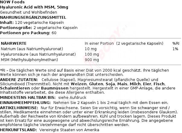 NOW Foods 2 x NOW Foods Hyaluronic Acid with MSM, 50mg - 120 vcaps
