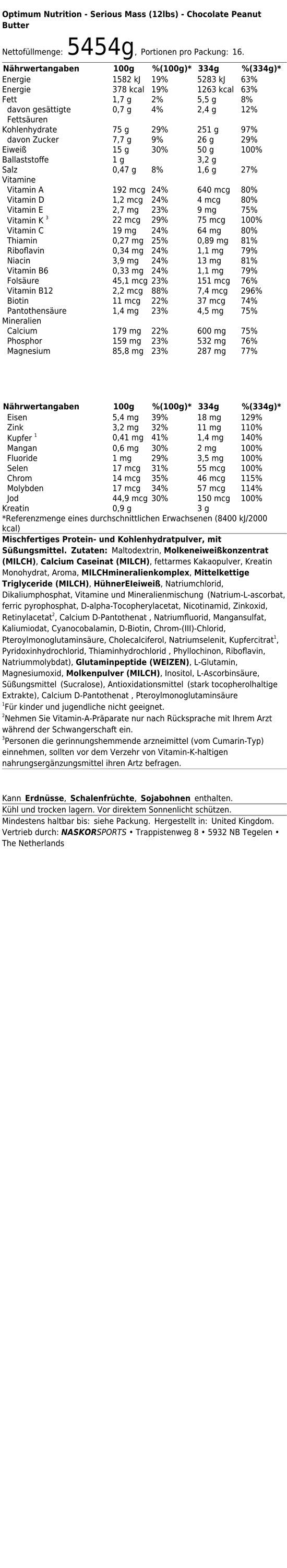 2 x Optimum Nutrition Serious Mass (12lbs) Chocolate Peanut Butter