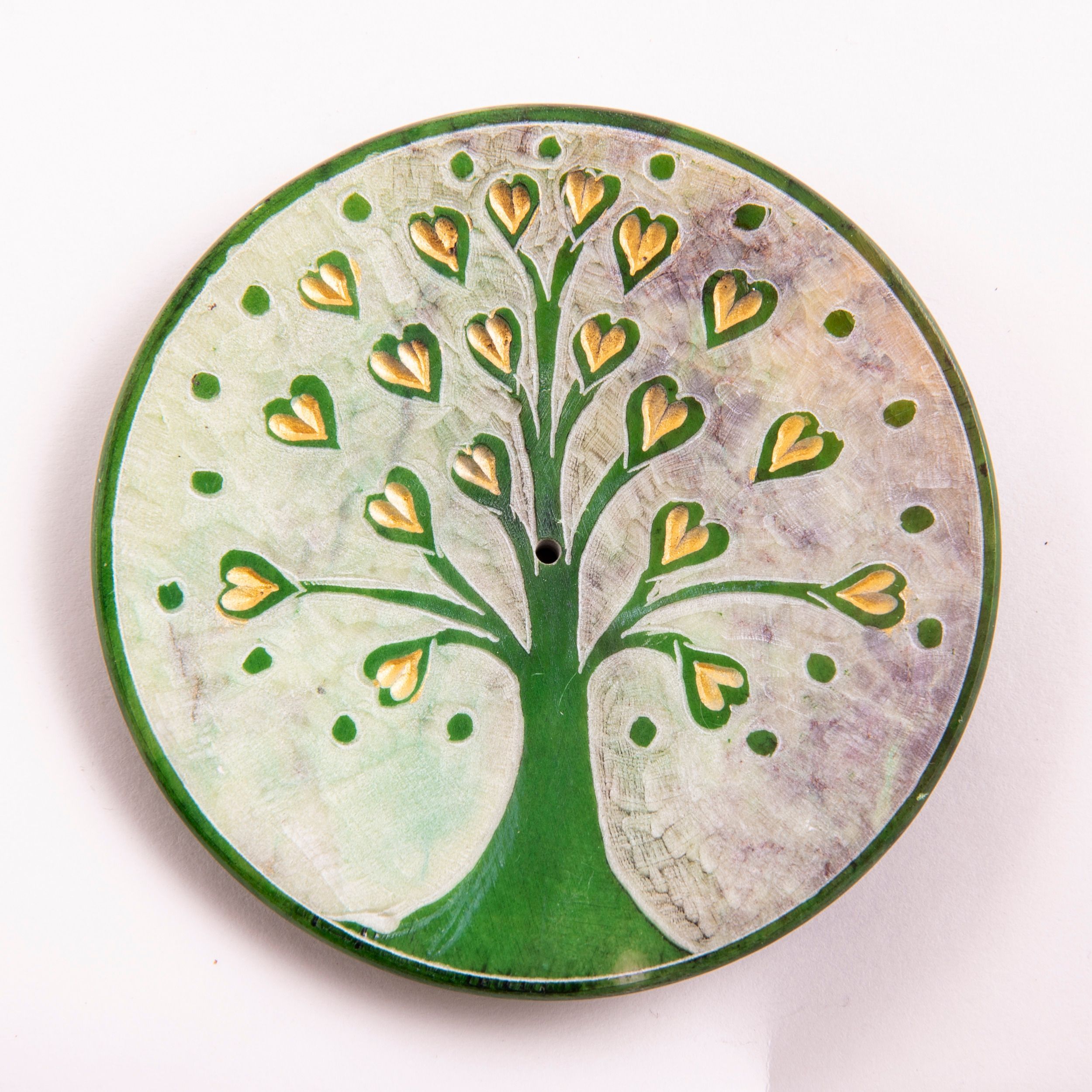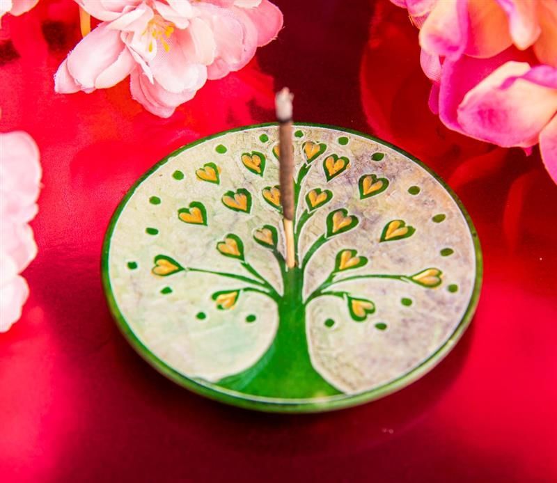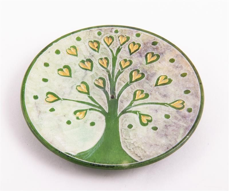 2 x Räucherstäbchenhalter Lebensbaum grün Speckstein 7,5 cm Handgraviert Teller