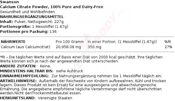 2 x Swanson 100% Pure and Dairy-Free Calcium Citrate Powder - 227g