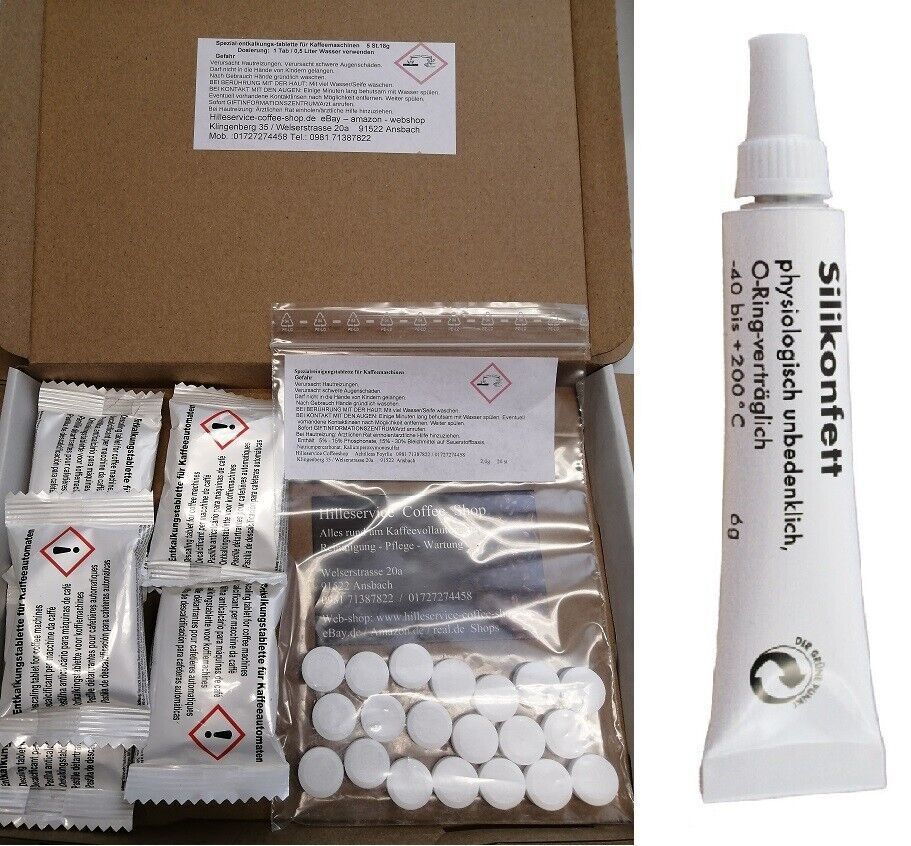 50 Reinigungstabletten 2 g + 20 Entkalkungstabletten 18 g für Kaffeevollautomaten + 6g Silikonfett Tube Über uns Wir reparieren täglich Kaffeevollautomaten verschiedenster Hersteller, dadurch haben wir Erfahrung mit den unterschiedlichen Ansprüchen der Maschinen. Die Reinigung der Kaffeemaschine ist