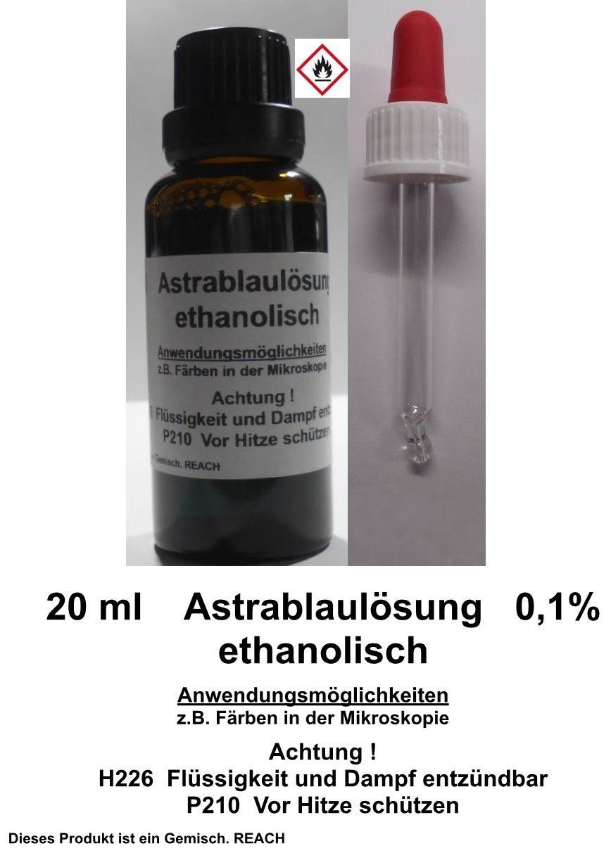 auch in 30ml erhältlich, siehe Angebote im Shop - 20 ml Astrablau Lösung 0,1% ethanolisch Andere Bezeichnung : Basic Blue 140 in einer Braunglasflasche mit passender Pipette (siehe Bild) (auch in 30 ml erhältlich, siehe weitere Angebote) Verwendungsmöglichkeiten (Beispiele) Mikroskopie : Anfärben (b