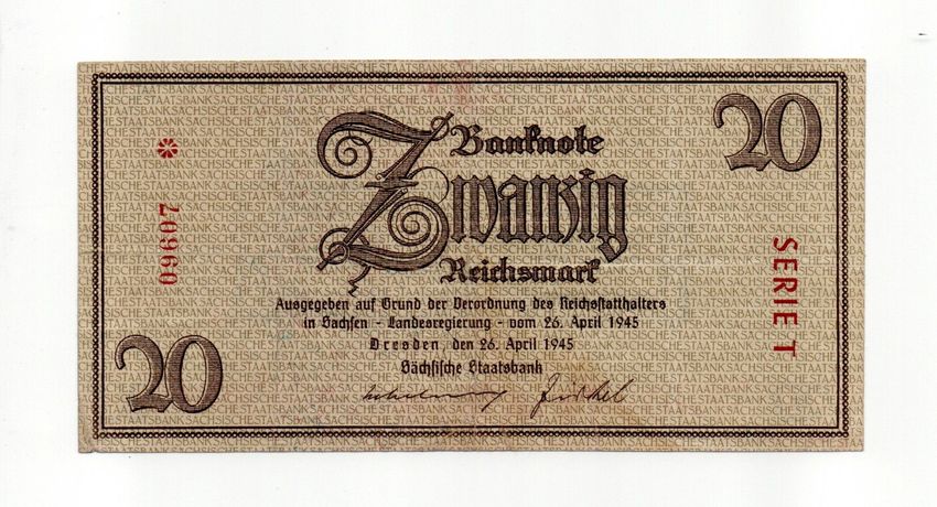 20 Reichsmark 1945 Rosenb. 184a Sächs. Staatsbank SERIE "T " SELTEN