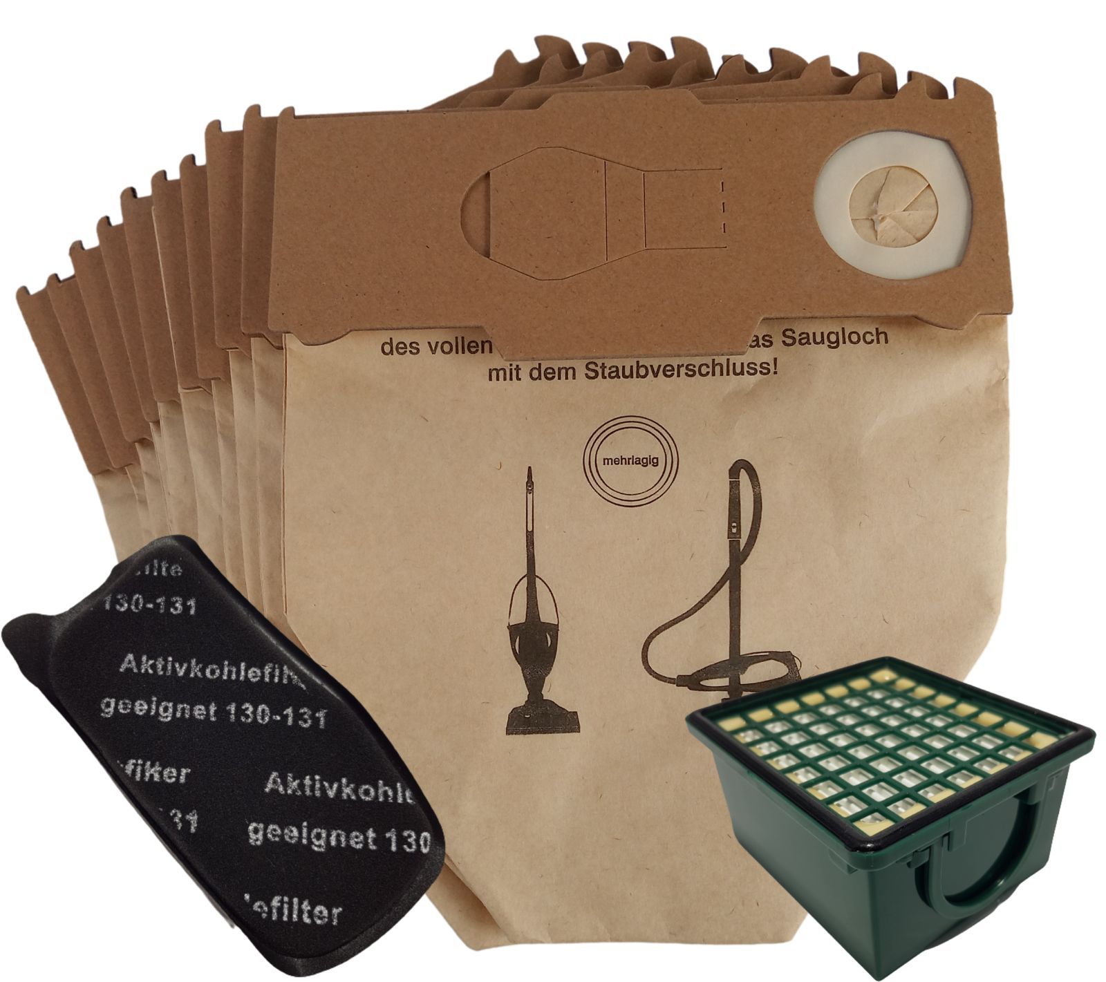 Andys-Saugerbedarf 20 Staubsaugerbeutel Papier geeignet Vorwerk Kobold VK 130 131 + Filter Set Artikelbeschreibung Sie erwerben 20 Staubsaugerbeutel. Mehrlagiges Spezialpapier. Stabile Deckscheibe. Mit Staubverschluss. Im Polybeutel. + 1 Hygiene Abluftfilter. + 1 Motorschutz Geruchsfilter. Passend f