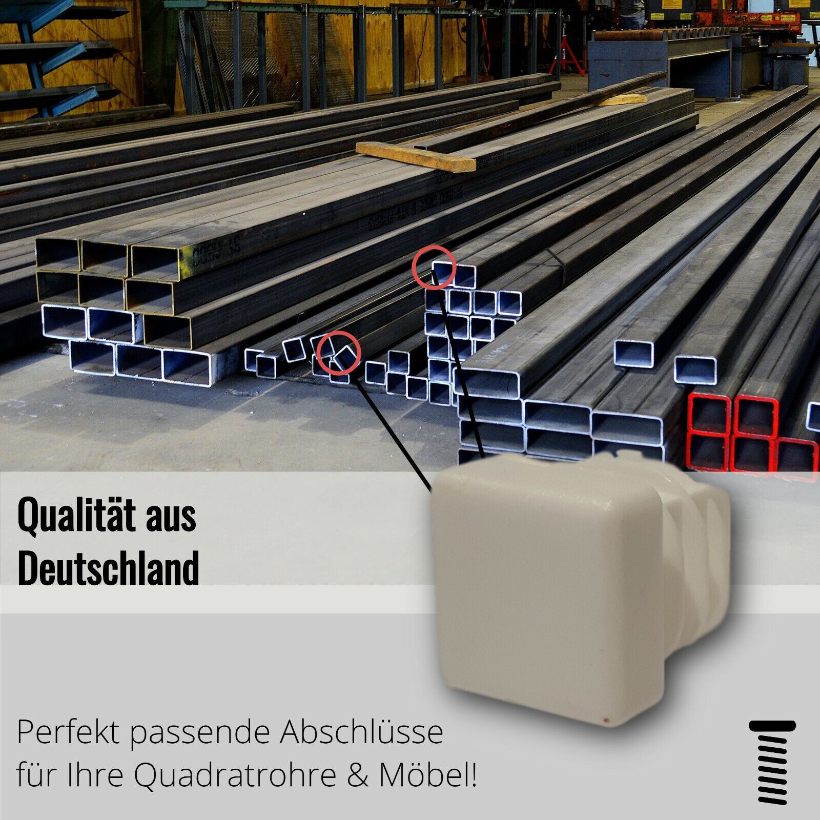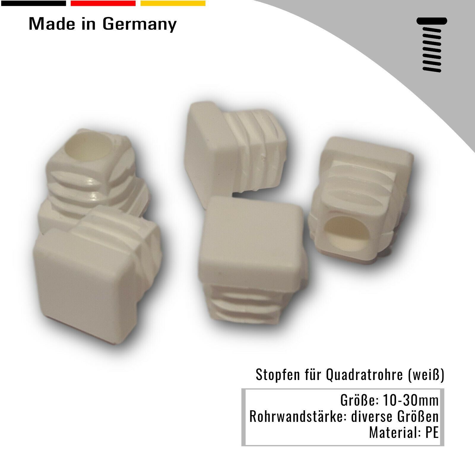 20 Stopfen mit Lamellen für vierkant Rohre, Kunststoff, Weiß Material: Kunststoff Farbe: Weiß Das erste Maß gibt das Rohraußenmaß an Die Gleiter sind für eine Wandstärke von 1,5-2 mm geeignet Die Abmessung 30 x 30 x 3 mm ist für eine Wandstärke von 3 mm geeignet