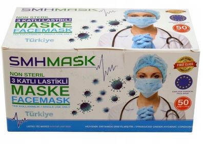 Dreilagige Einweg-Gesichtsmaske mit Gummibaendern - 50 Stueck Packung