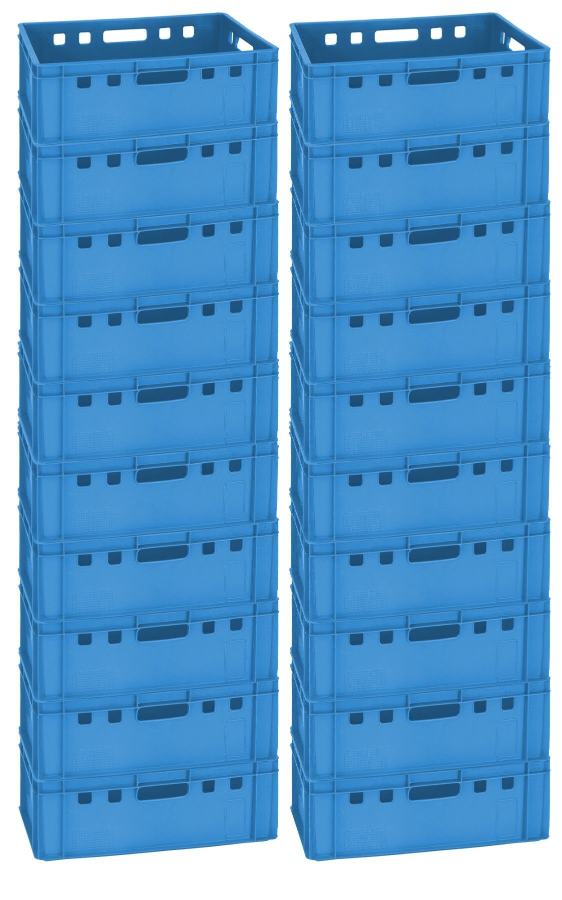 20 Stück Metzgereikiste Blau E2 - Material: Polypropylen (PP) - Innenmaß: 570 x 365 x 190 mm - Außenmaß: 600mm x 400mm x 200mm Volumen: 40 Liter - stapelbarer Aufbewahrungsbehälter mit 2 Transportgriffen - Europastandardmaterial Polypropylen PP - extrem wiederstandsfähiges und elastisches thermoplastisches Copolymer - lebensmittelneutral - geruchs- & geschmacksneutrale Lagerung - resistent gegen Nässe, Insekten & Pilzbefall - geeignet für Hochdruckreinigung (Artikelabbildung ähnlich)