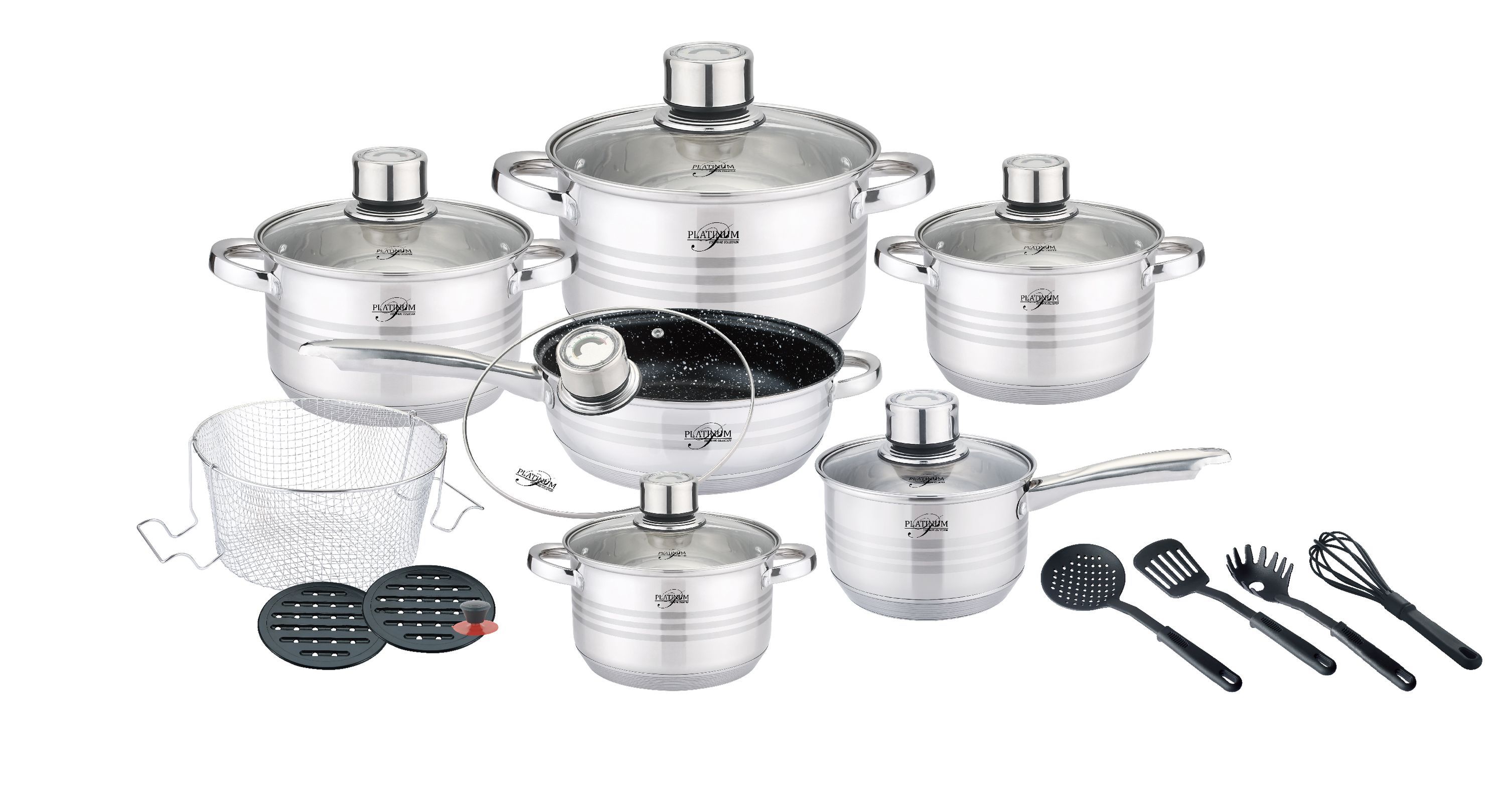 • 18 tlg Edelstahl Kochgeschirr Induktion Kochtopf Topf Set Pfanne Küchenhelfer