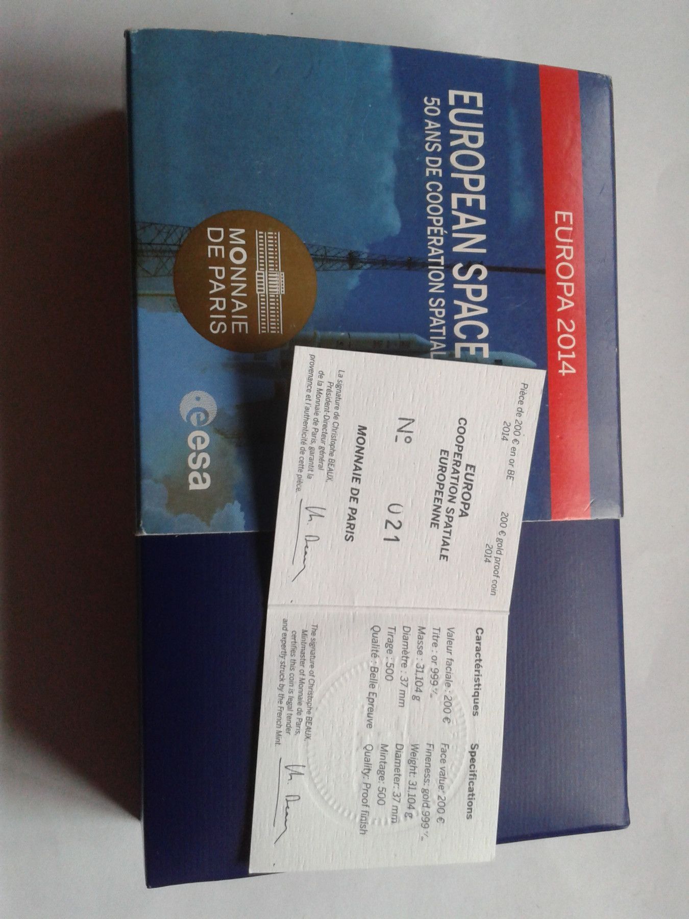 200 euro 2014 PP Frankreich ESA Raumfahrt: Etui, Zertifikat und Umverpackung