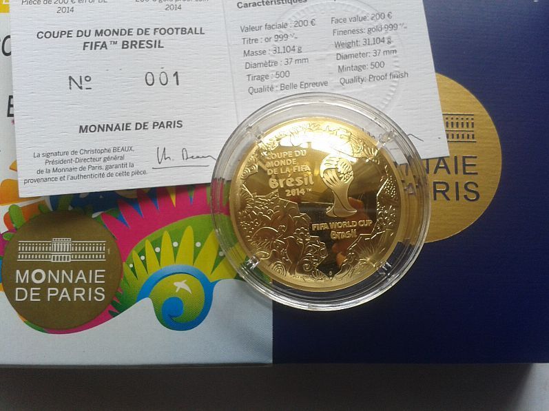 FÜR WELTMEISTER 200 euro 2014 PP Gold Frankreich 31,1g 1 Unze 999er Gold FIFA WM Brasilien, ZERTIFIKATNUMMER 1; Insgesamt nur 419 Ex. geprägt. alles original verpackt, mit Etui und Zertifikat und Umverpackung. SEHR SELTEN AM MARKT