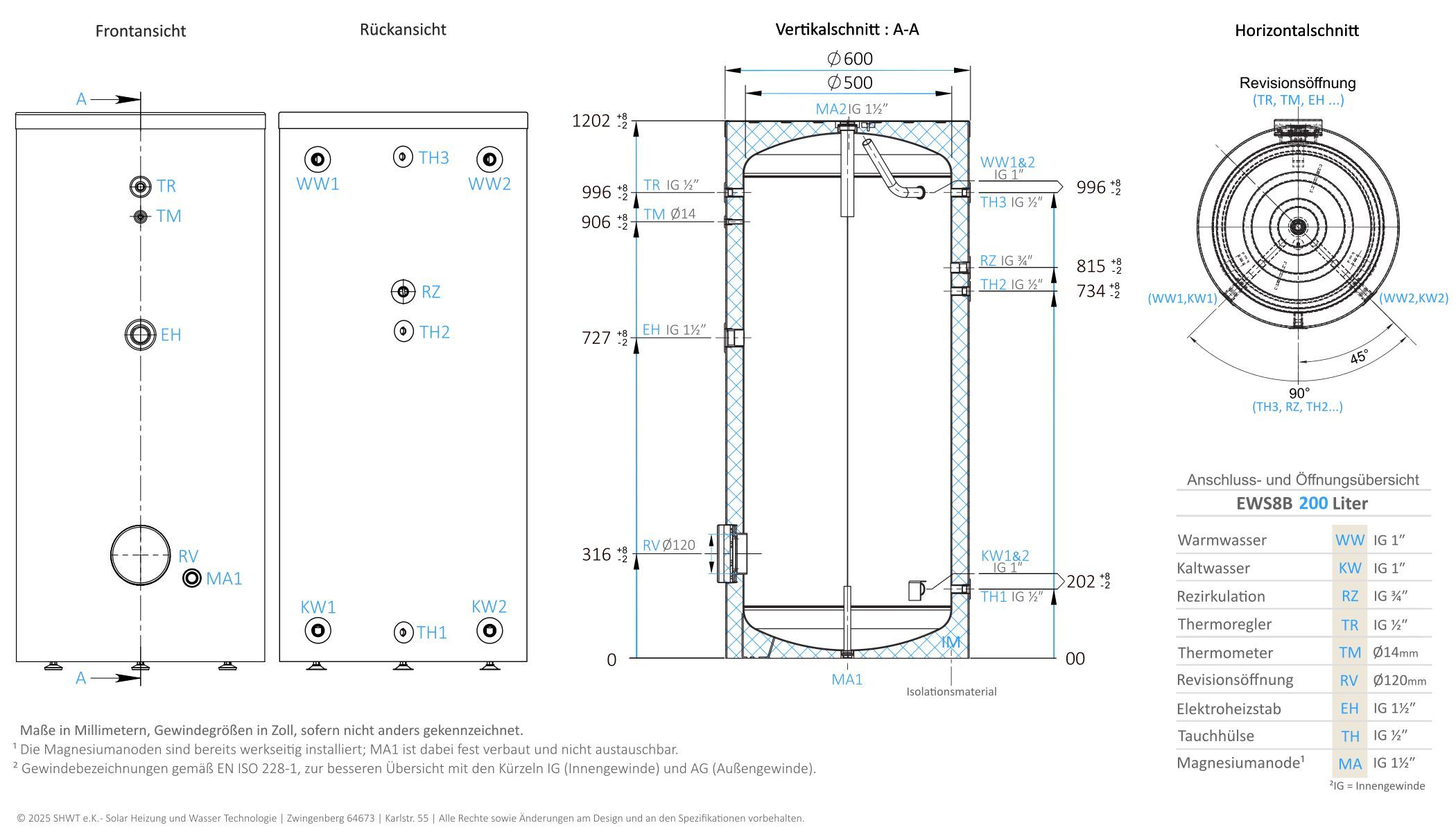 • Neue Generation 200 Liter Warmwasserspeicher, mit 1 elliptischen Wärmetauscher, inkl