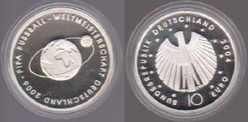 BRD 10 Euro 2004 FIFA Fußball-Weltmeisterschaft 2006 (Ausgabe II) (Polierte Platte) (Prägebuchstabe J - Hamburg) Daten der Münze: Metall: Sterlingsilber (925 1000) Durchmesser: 32,5 mm Gewicht: 18 g Auflage: 80.000 Exemplare ( je Prägebuchstabe )