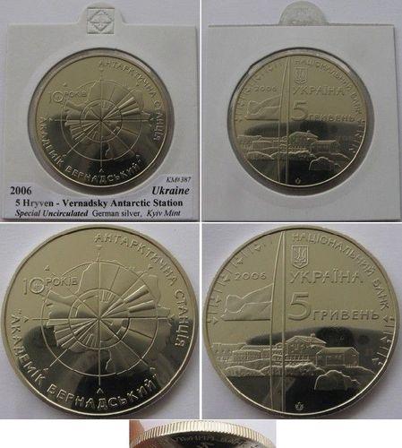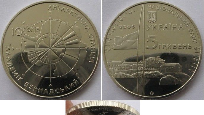 Auction coin: 2006, Ukraine, 5 Hryven, a commemorative issue: Vernadsky Antarctic Station”. Features: special uncirculated, composition: nickel silver, diameter-35.0 mm, weight: 16.5 g. Mintage of 60,000 pcs . Mint: Kyiv,Ukraine. Obverse: the Ukrainian flag flying on a vertical stock; beneath