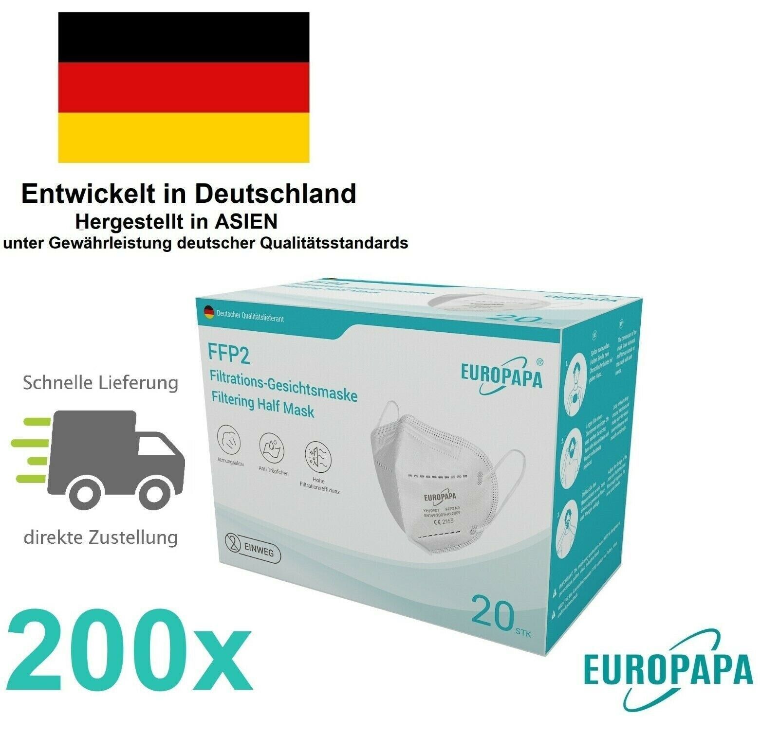 200x Europapa FFP2 Atemschutzmaske CE2163 Maske FFP 2 Mundschutz Maske