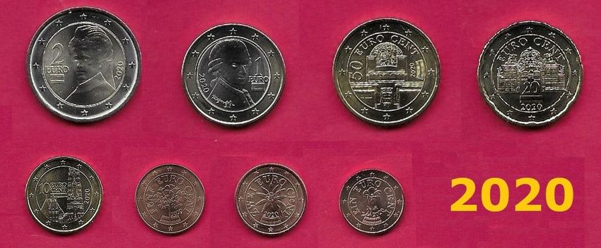 2020 Österreich Münzen 1 Ct & 2 Ct & 5 Ct & 10 Ct & 20 Ct & 50 Ct & 1 € & 2 € UNC
