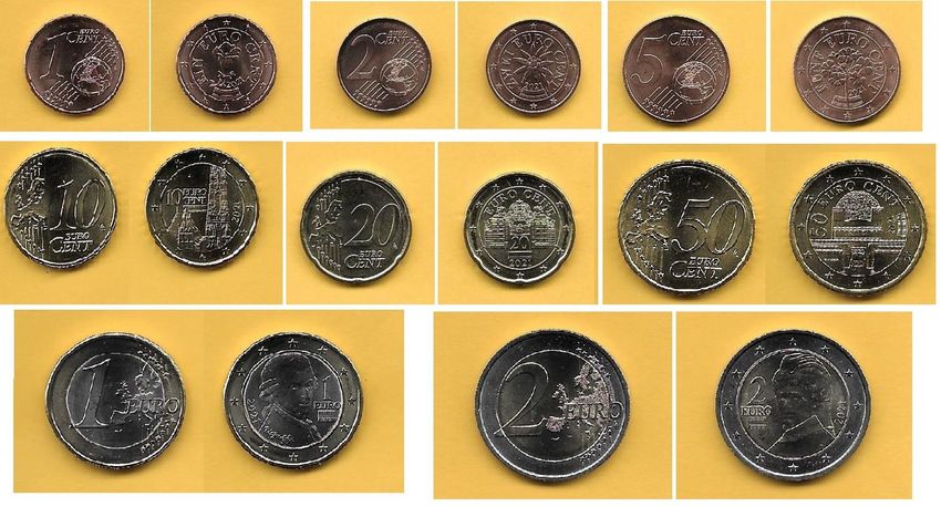 2021 Österreich Münzen 1 Ct & 2 Ct & 5 Ct & 10 Ct & 20 Ct & 50 Ct & 1 € & 2 € UNC