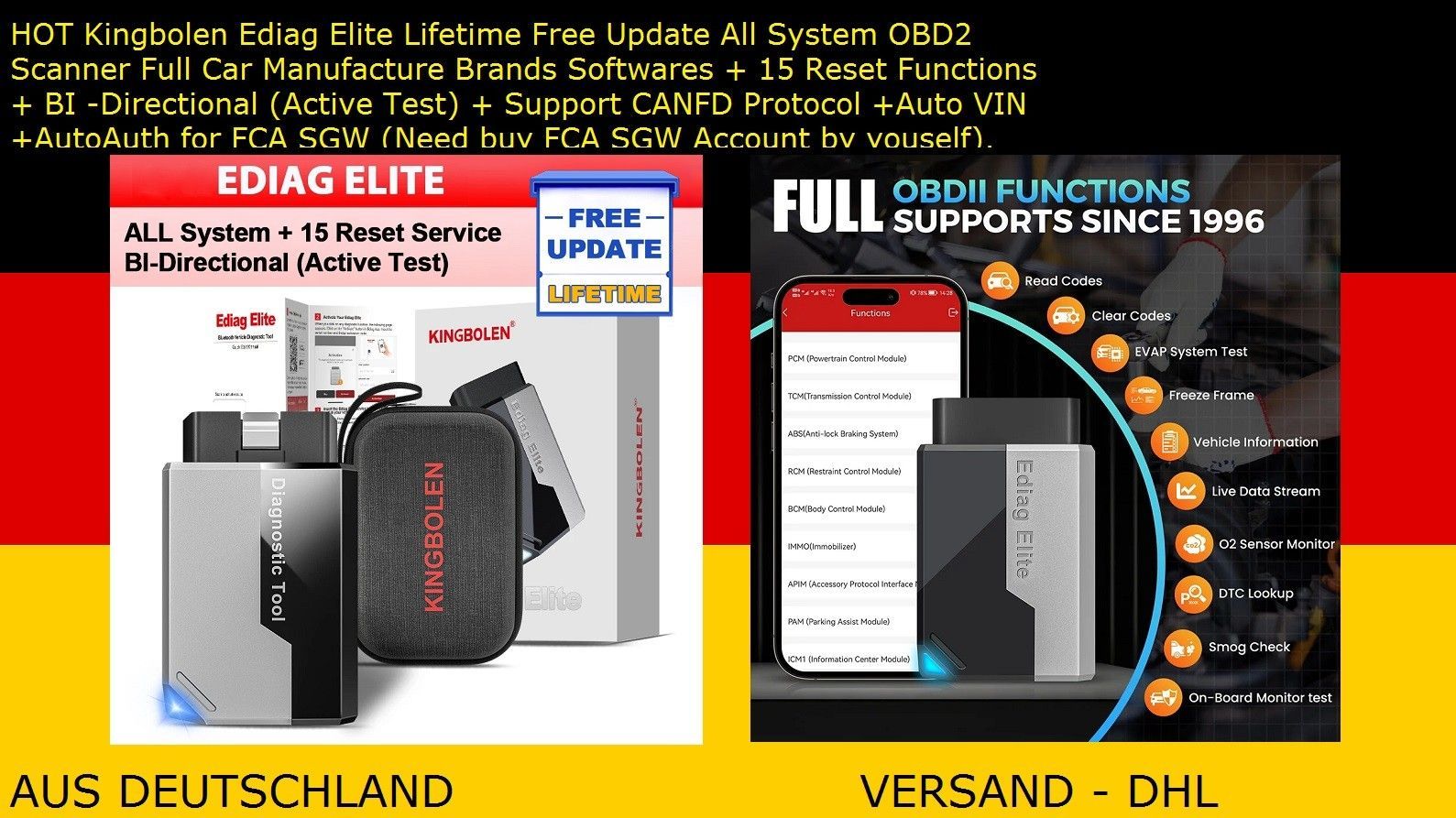 EDIAG ELITE Kingbolen Ediag Elite – Lebenslange kostenlose Updates für alle OBD2-Systeme. Vollständige Software für alle Fahrzeughersteller + 15 Reset-Funktionen + Bidirektionaler Test (Aktivtest) + CANFD-Protokollunterstützung + Auto-VIN + AutoAuth für FCA SGW (FCA SGW-Konto separat erhältlic