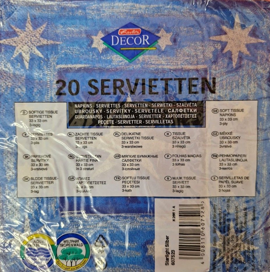 Herlitz 20x Herlitz Decor Servietten 3-lg 33 x 33 cm 1/4 Falz "Starlight Silber" Restposten