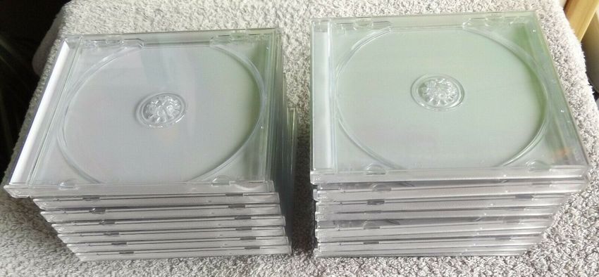 20 Leerhüllen: Für jeweils 1 CD oder DVD oder Blu-ray oder Rohling Größere Mengen Leerhüllen können gerne angefragt werden !!! Jewelcase, transparent und weiß Mit vier festen Halterungen für booklet o.ä. Aus hartem Kunststoff Ca. 14,2 cm x 12,5 cm x 1 cm Gebraucht und unterschiedliche Erhaltung, abe
