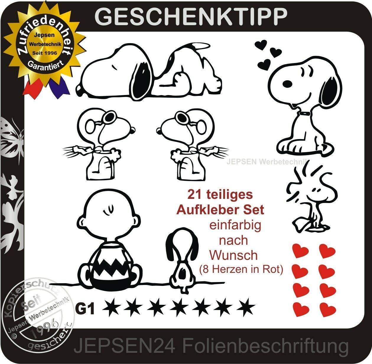 21 Aufkleber Snoopy Charly Woodstock - Wunschfarbe - Set G1 + Gratis Herzen in Rot