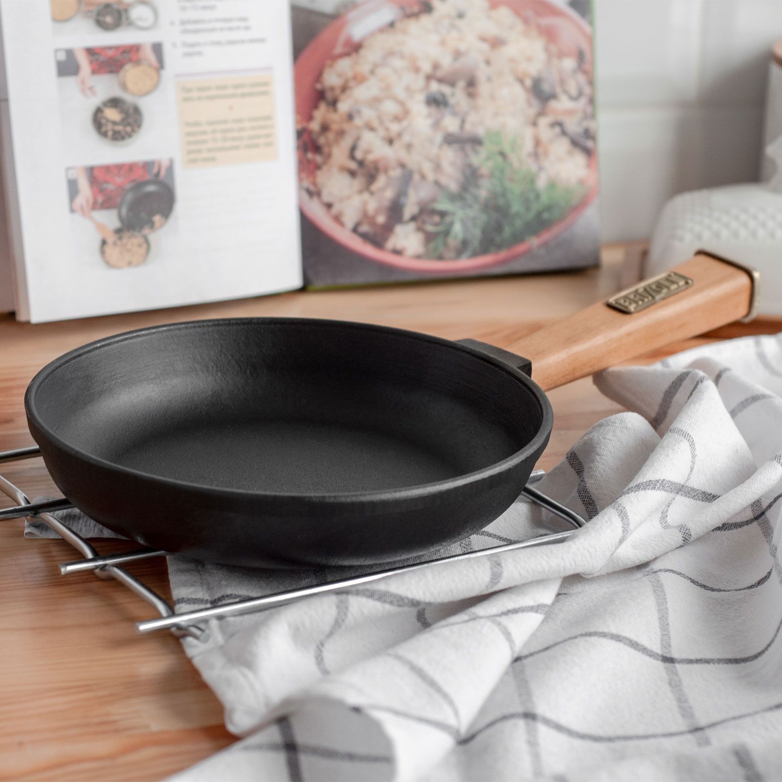 24cm Gusseisenpfanne 47mm hoch mit Holzgriff und Glasdeckel Induktion Bratpfanne