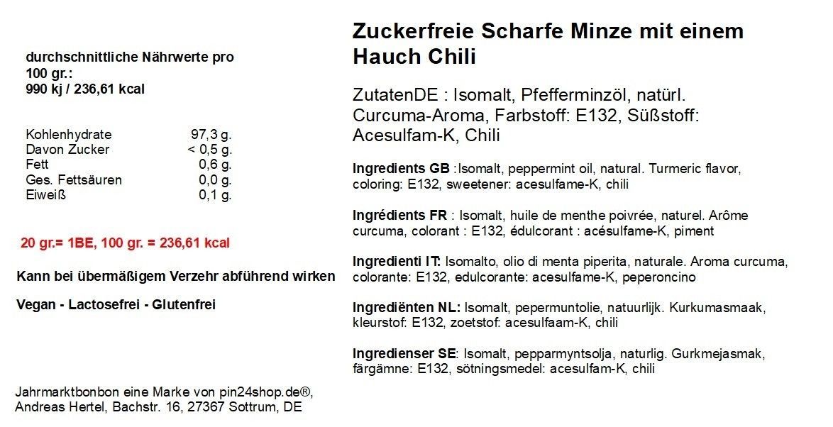 250 gr. Zuckerfreie Scharfe Minze mit einem Hauch Chili in Miniform von Jahrmarktbonb