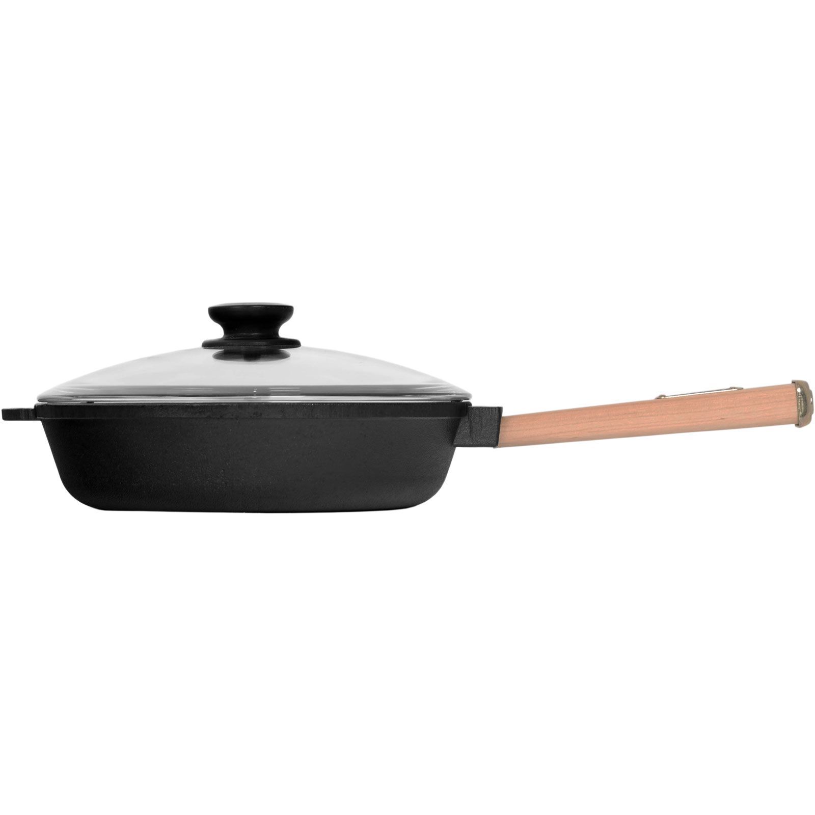 26cm Gusseisenpfanne 65mm hoch mit Holzgriff und Glasdeckel Induktion Bratpfanne
