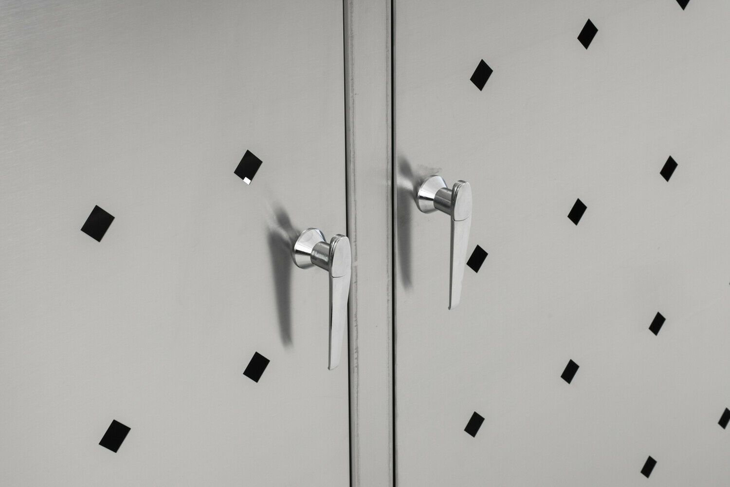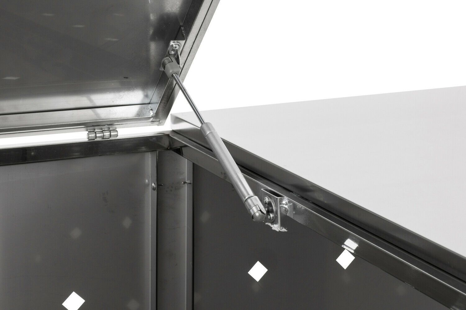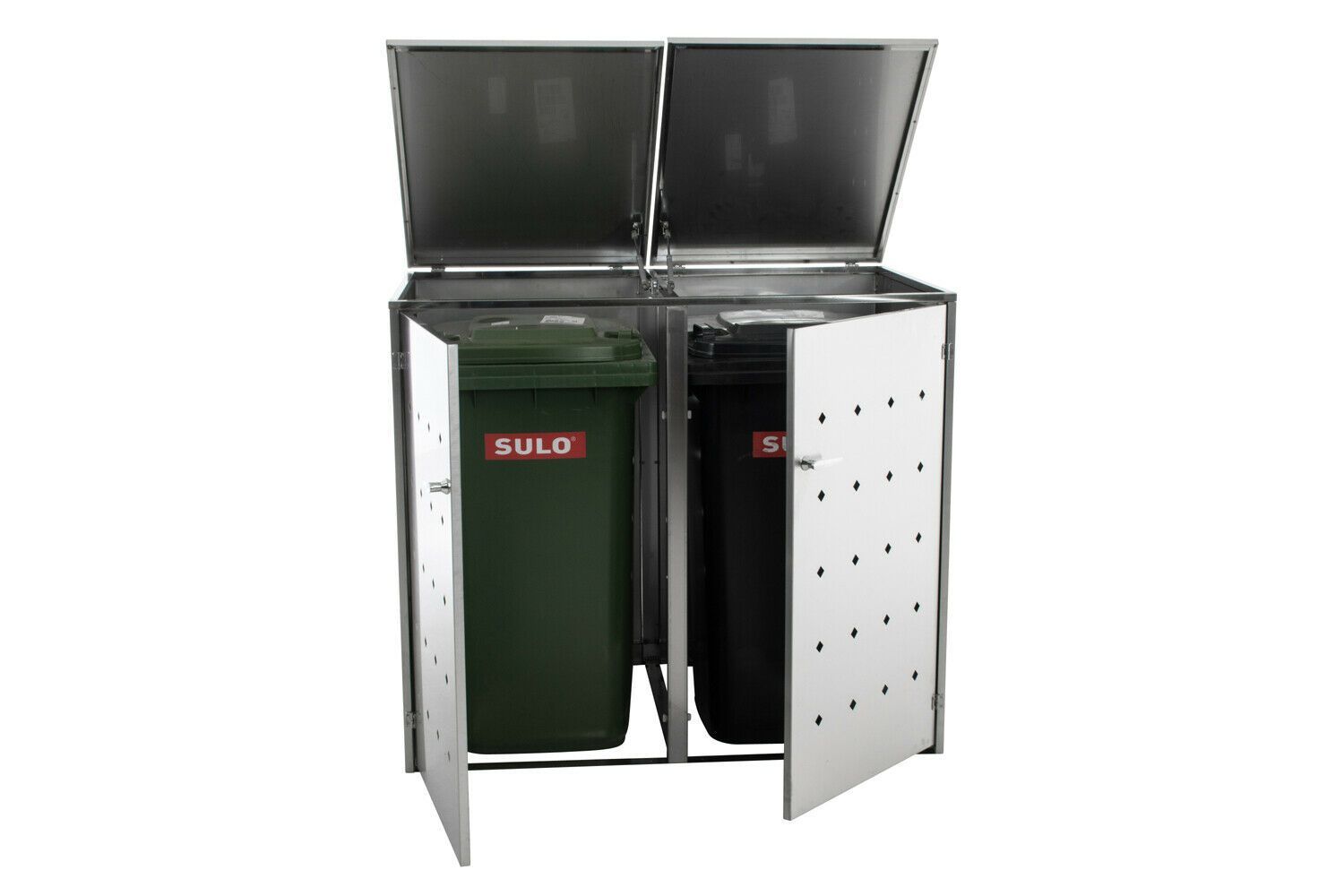 2er Mülltonnenverkleidung Diese sehenswerte und zugleich praktische Verkleidung aus Edelstahl bietet Schutz für zwei Mülltonnen jeweils mit dem Volumen von bis zu 240 Liter. Mithilfe der Tür lässt sich die Mülltonne ganz leicht aus der Box ziehen und später wieder platzieren, dabei ist sie mit einem