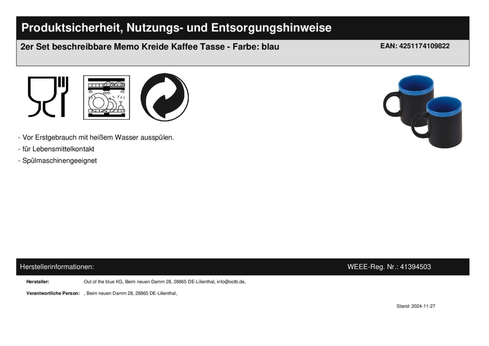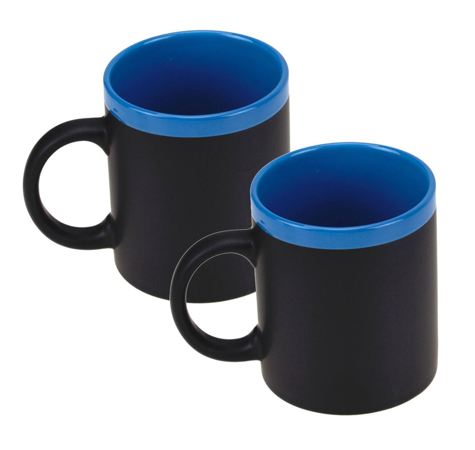 Out of the Blue 2er Set Beschreibbare Keramik Memo Kaffee Tasse mit Kreide Kaffeebecher blau