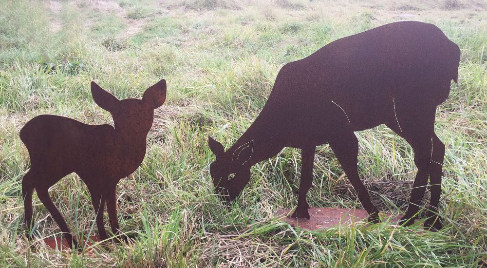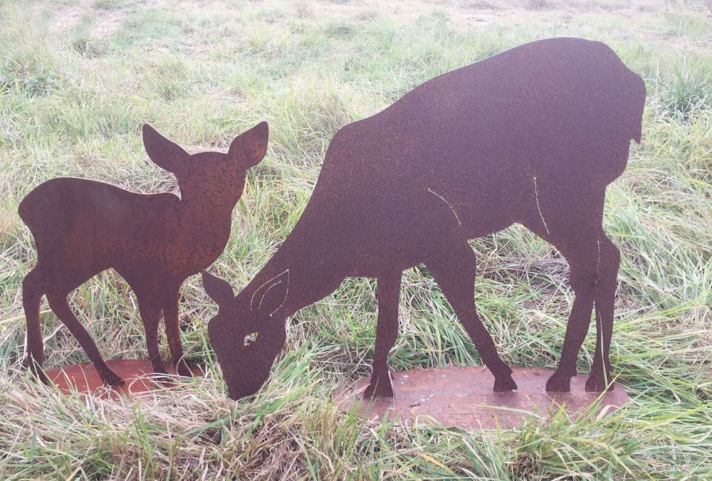 2er Set Fressendes Reh mit Rehkitz Kitz Hirsche Rehe äsend Rost Edelrost Metall