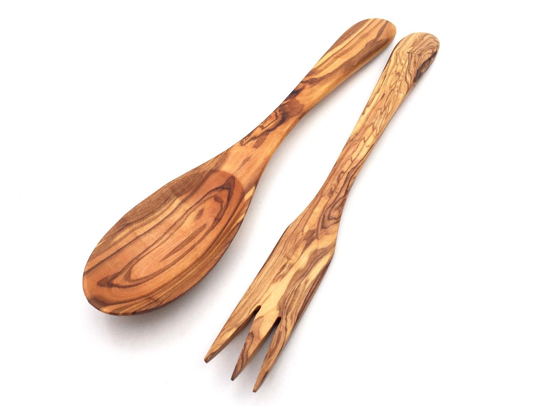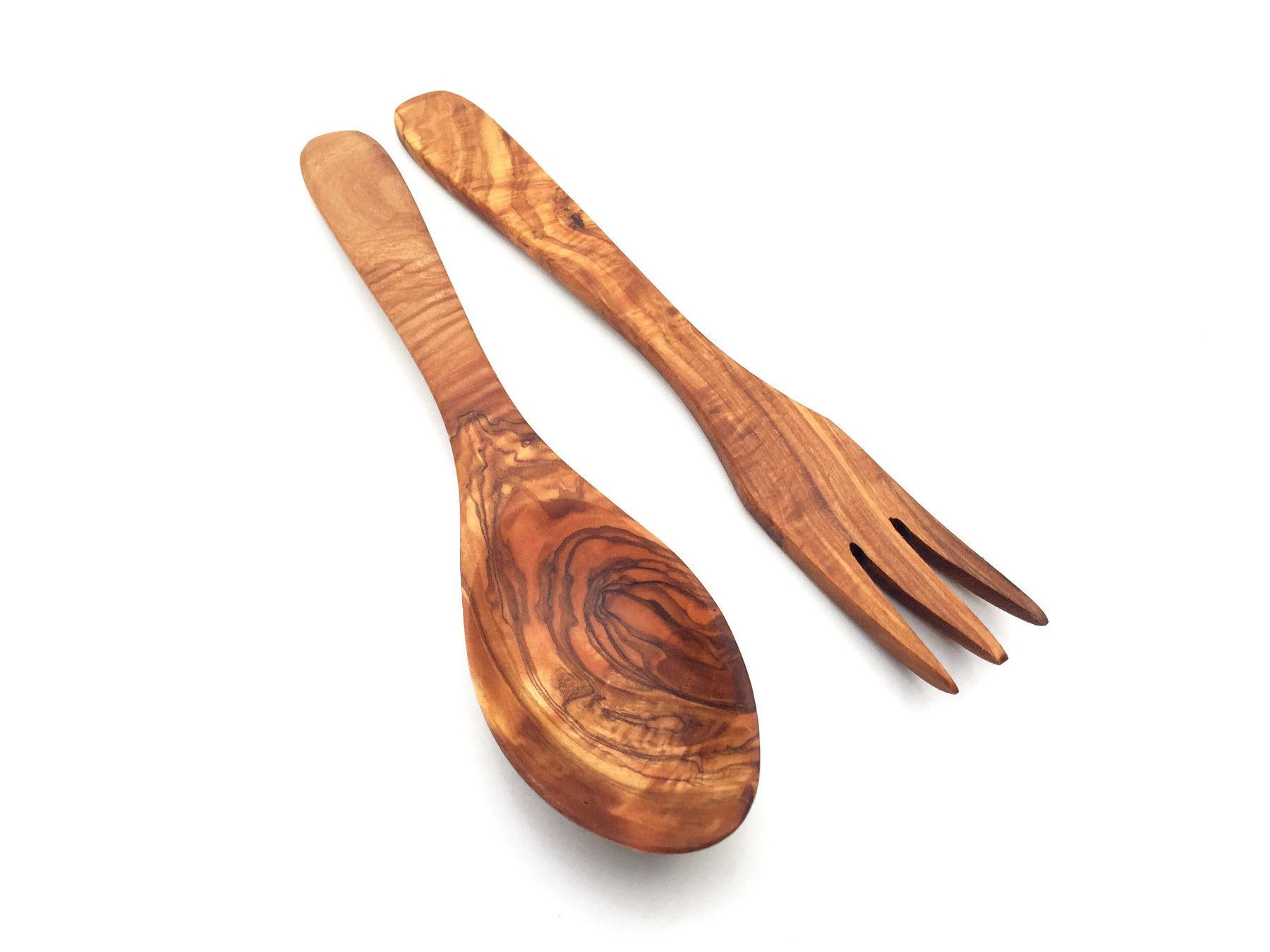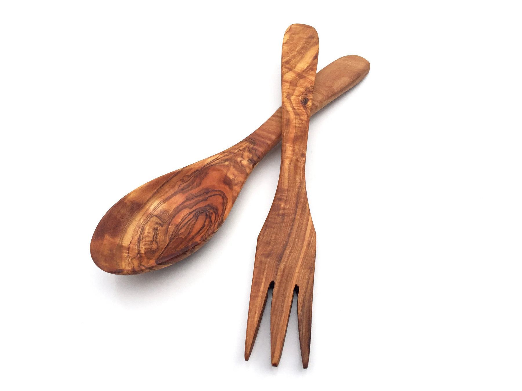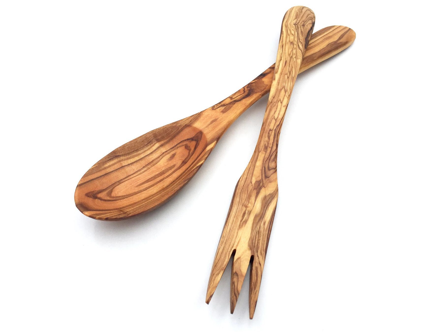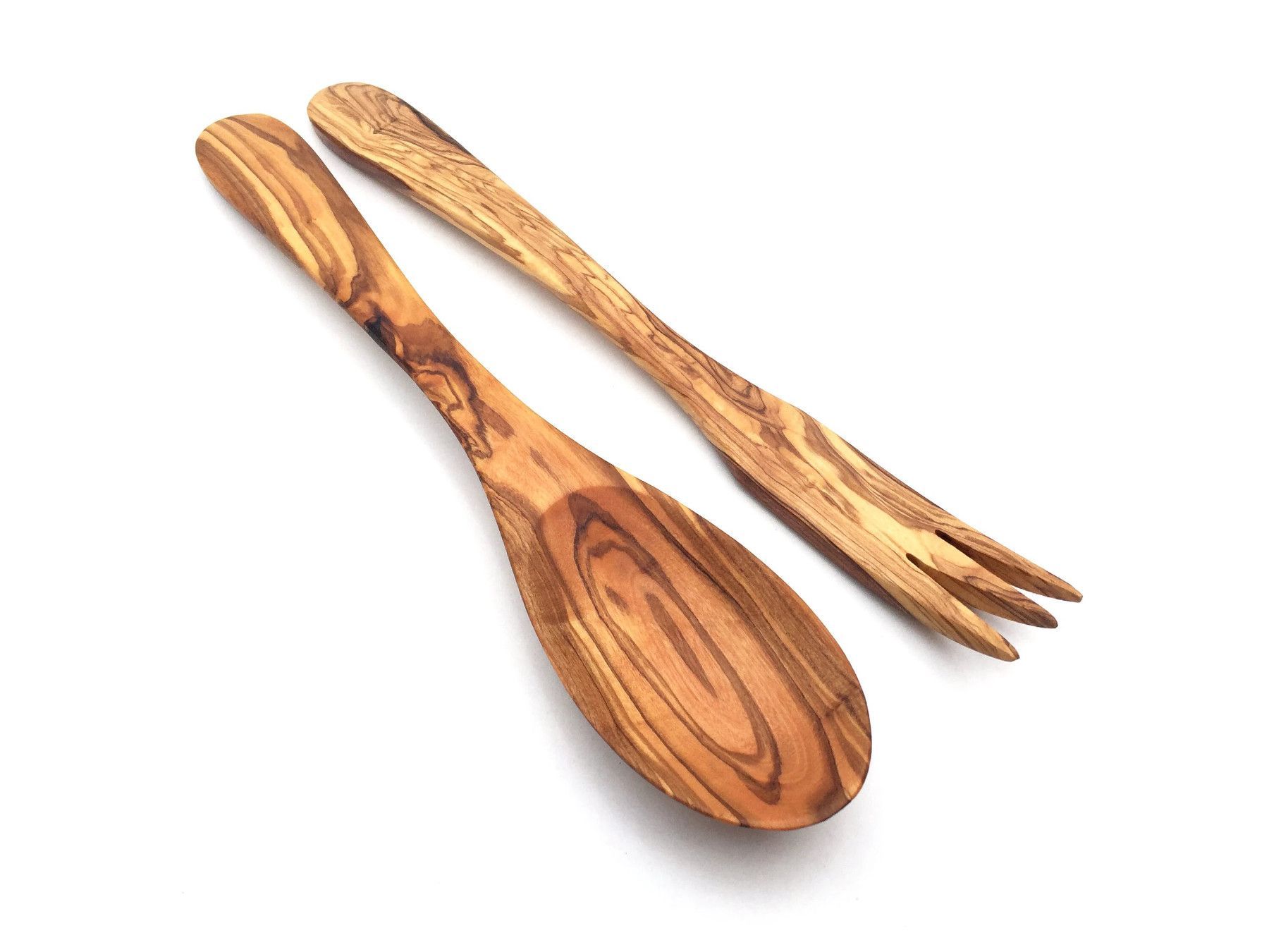 Salatbesteck 2er Set 25 - 30 cm Das 2er Set Salatbesteck ist aus Olivenholz und in Handarbeit angefertigt. Der künstlerisch begabte Handwerker hat jedes Stück einzeln per Hand hergestellt, was jedes Stück zu einem Unikat macht. Die einzigartige rötlich-braune Maserung mit einem unregelmäßigen Faserv
