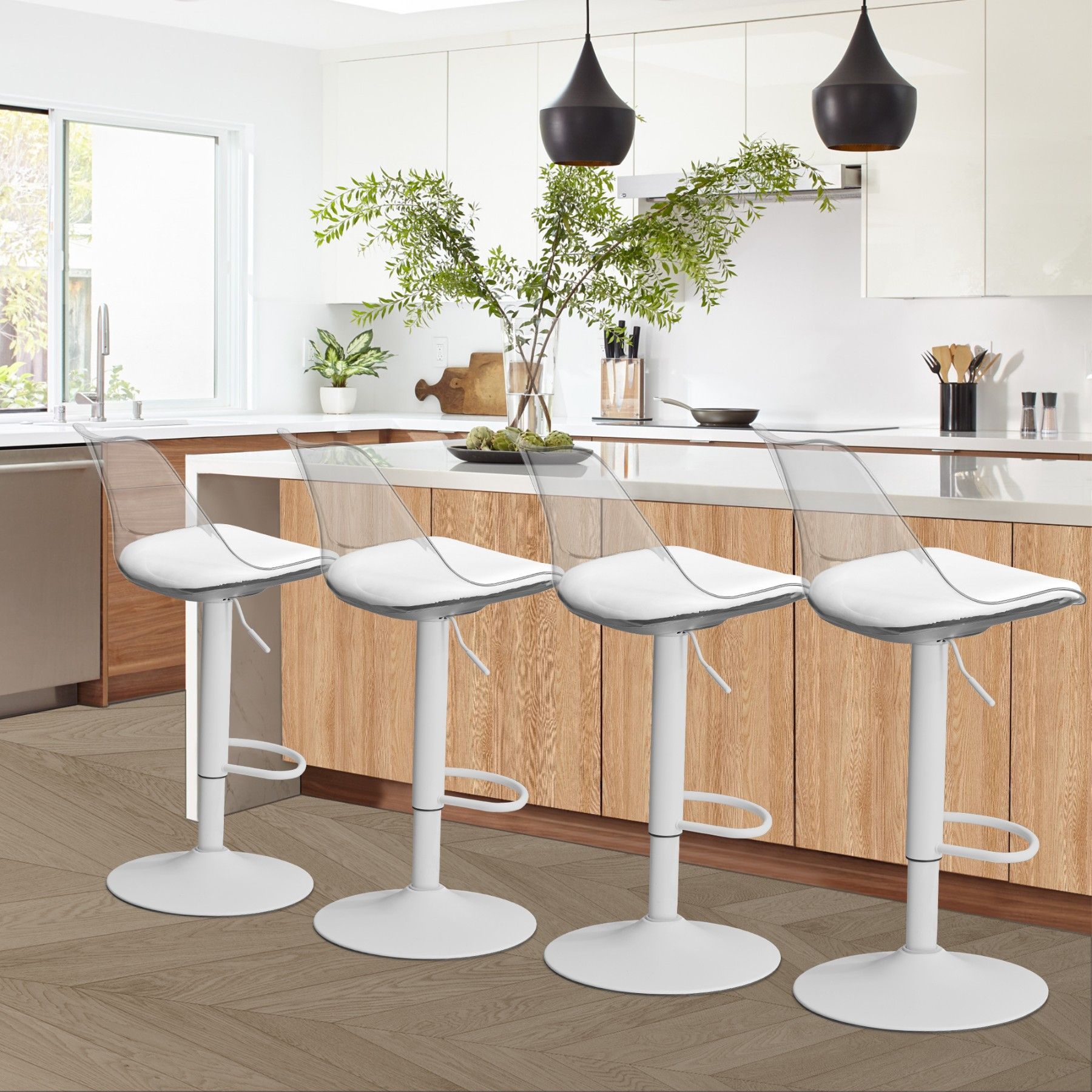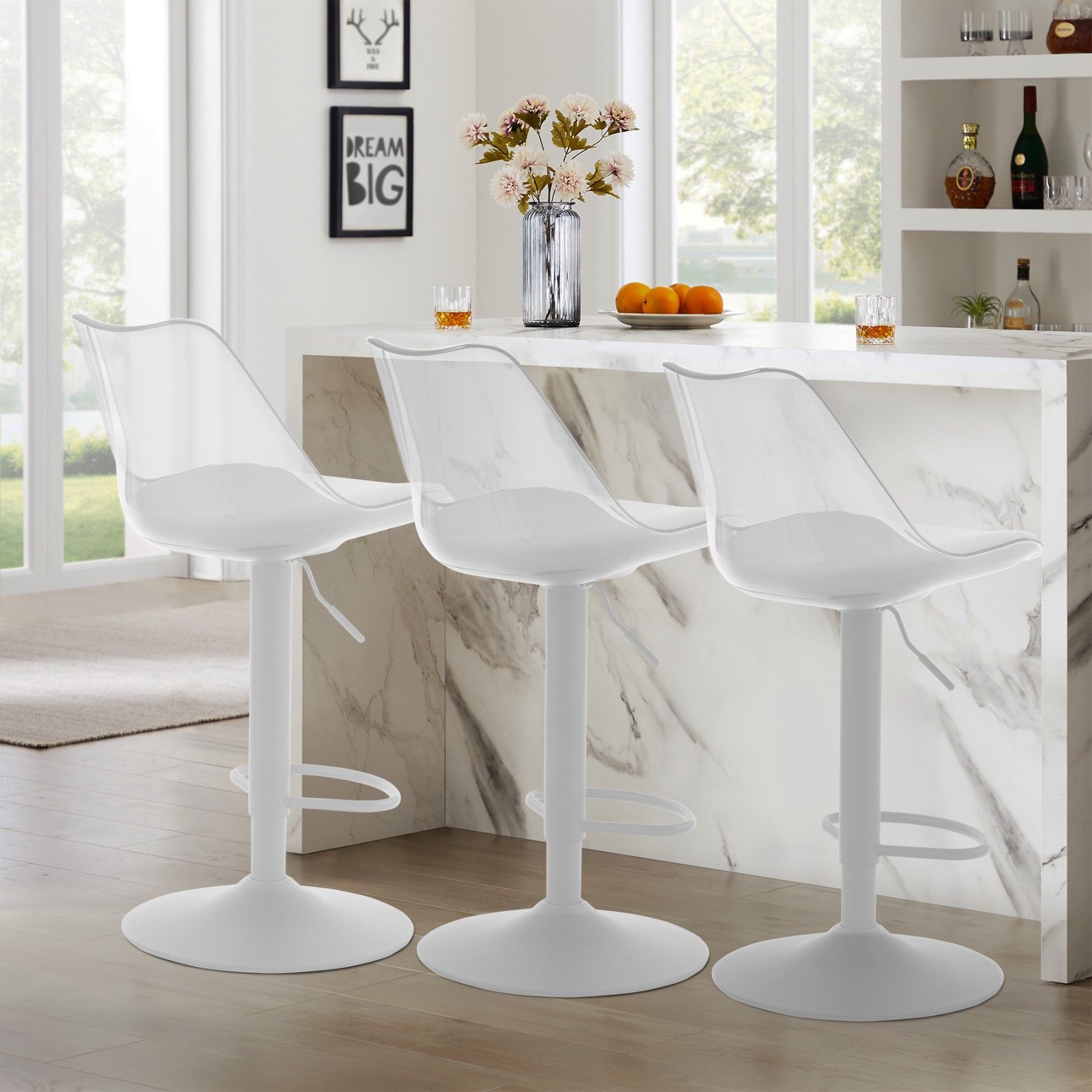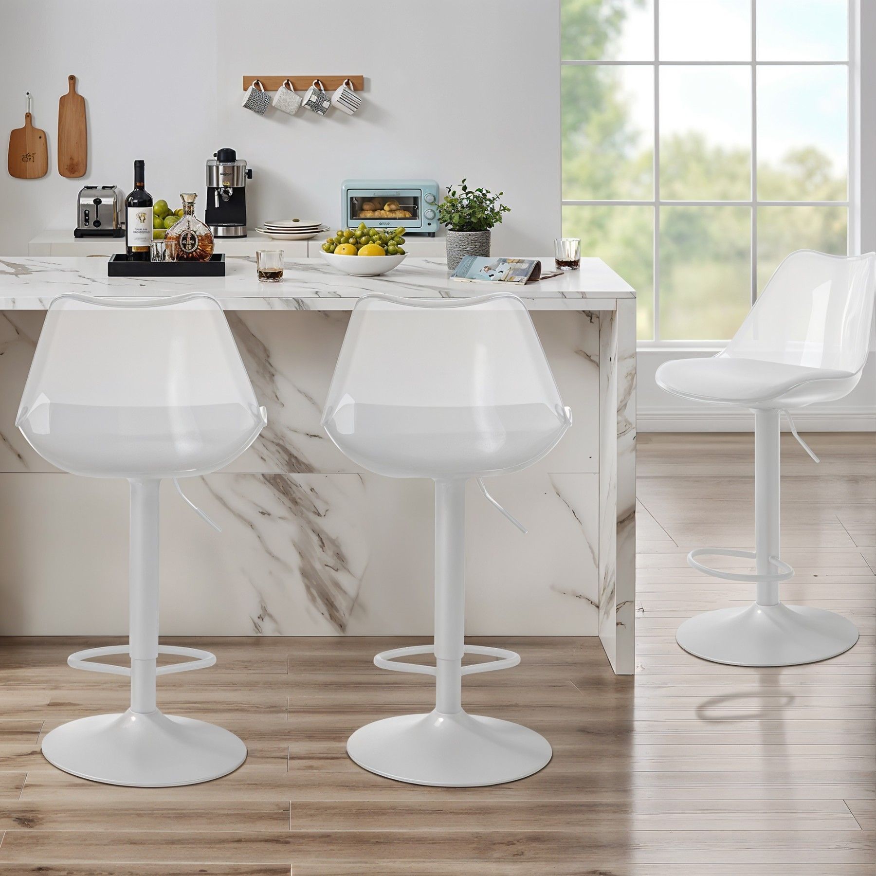 Dieses Set transparenter Barhocker vereint modernes, klares Design mit außergewöhnlichem Komfort. Mit gepolsterter Rückenlehne, 360°-Drehfunktion und stabiler Fußstütze sind diese Barhocker perfekt für Küche, Esszimmer oder Bar. Langlebig, vielseitig und stilvoll – die idealen Hocker für Ihr Zuhause.
