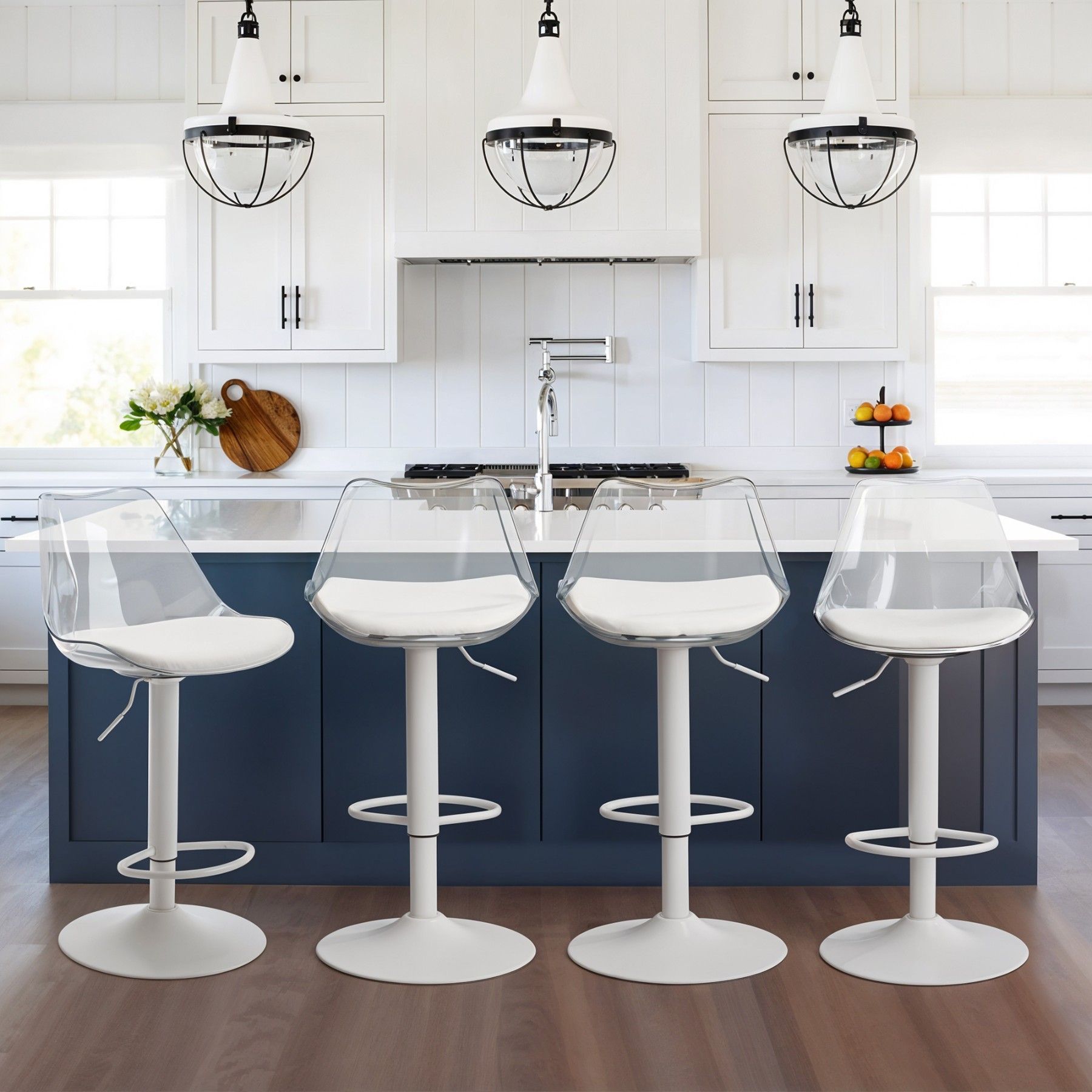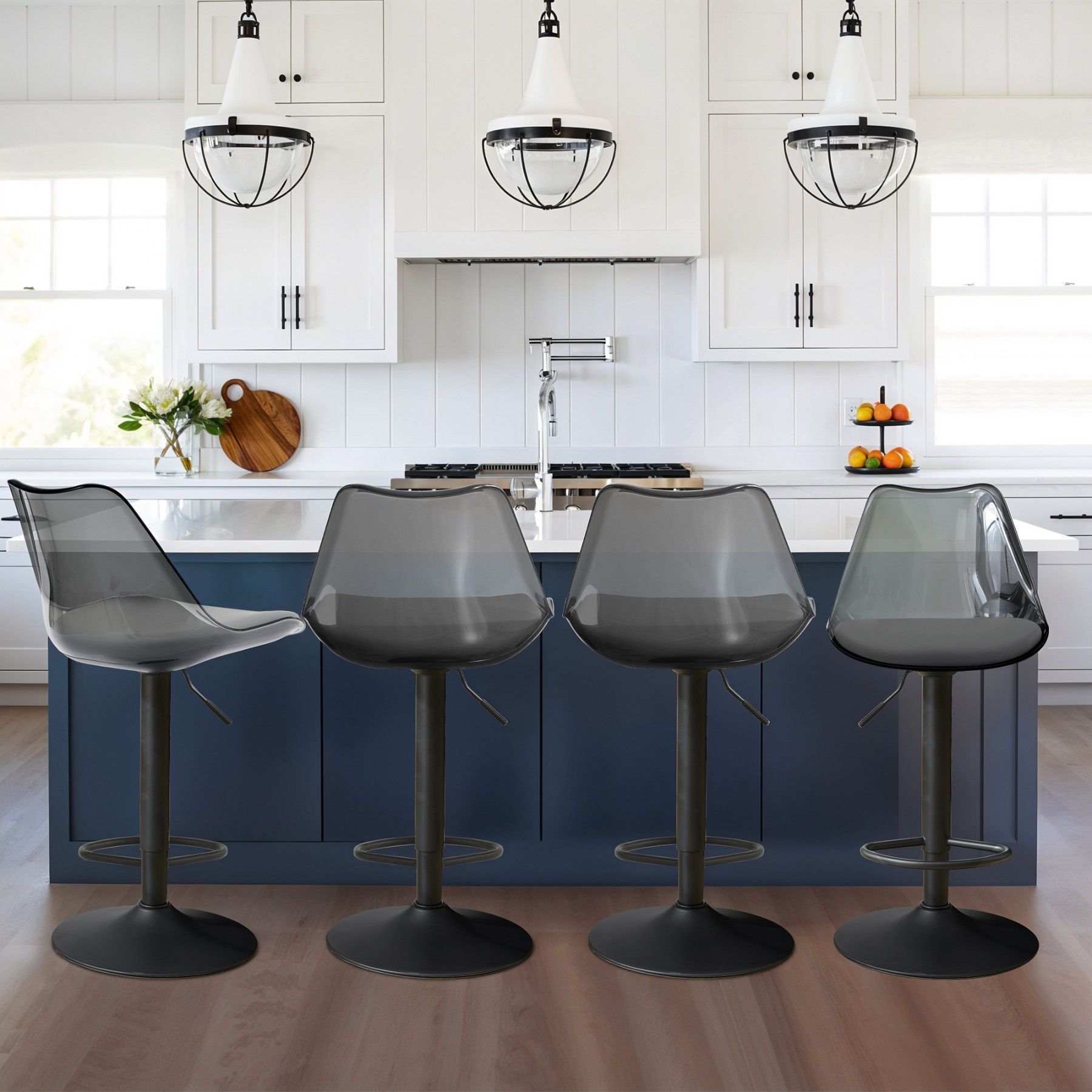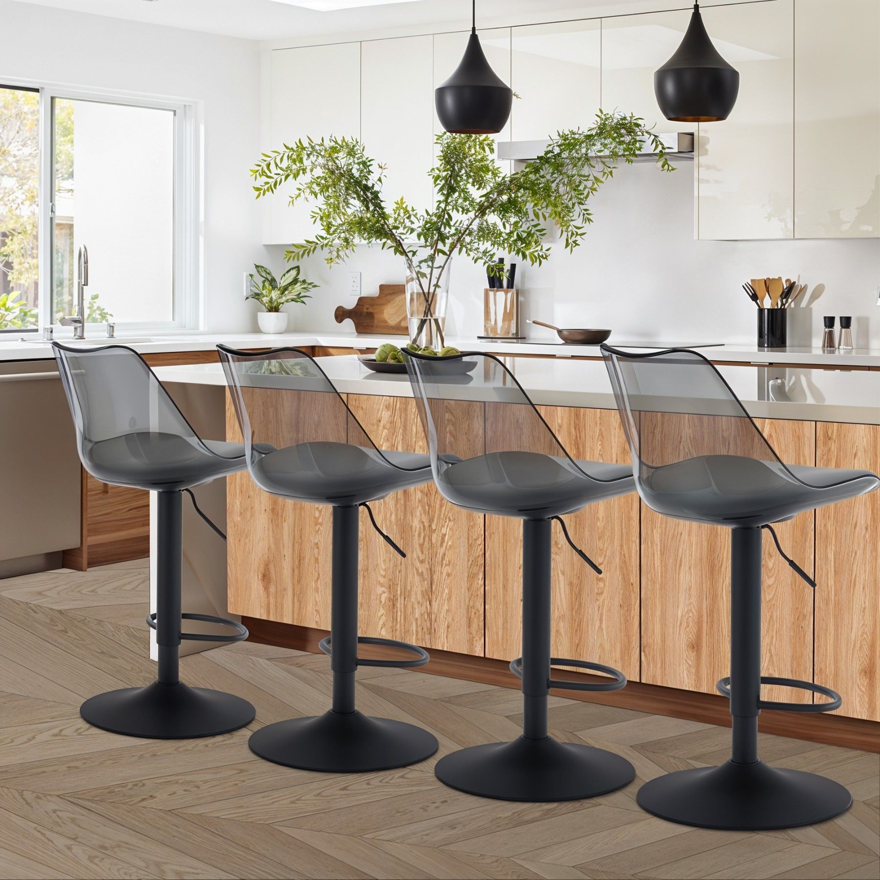 Dieses Set transparenter Barhocker vereint modernes, klares Design mit außergewöhnlichem Komfort. Mit gepolsterter Rückenlehne, 360°-Drehfunktion und stabiler Fußstütze sind diese Barhocker perfekt für Küche, Esszimmer oder Bar. Langlebig, vielseitig und stilvoll – die idealen Hocker für Ihr Zuhause.