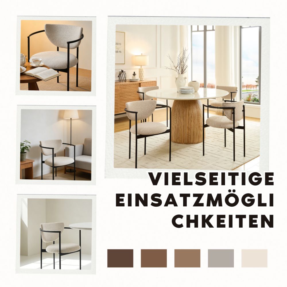 Zimmerstuhl mit Armlehnen im 2er-Set in Khaki. Bezug aus Stoff, stabiles schwarzes Metallgestell und modernes Design. Ergonomische Form für angenehmen Sitzkomfort im Esszimmer, Wohnzimmer oder Büro.