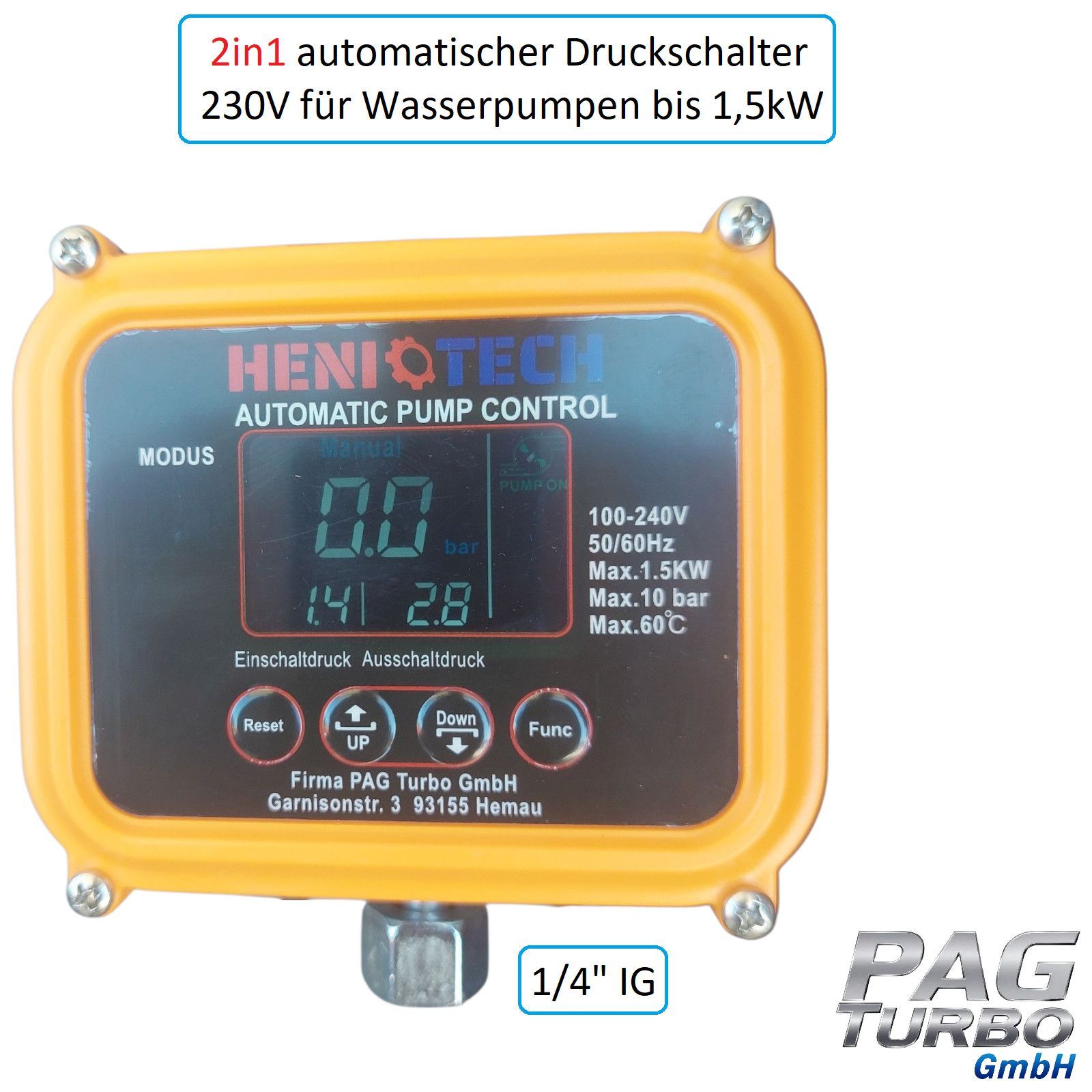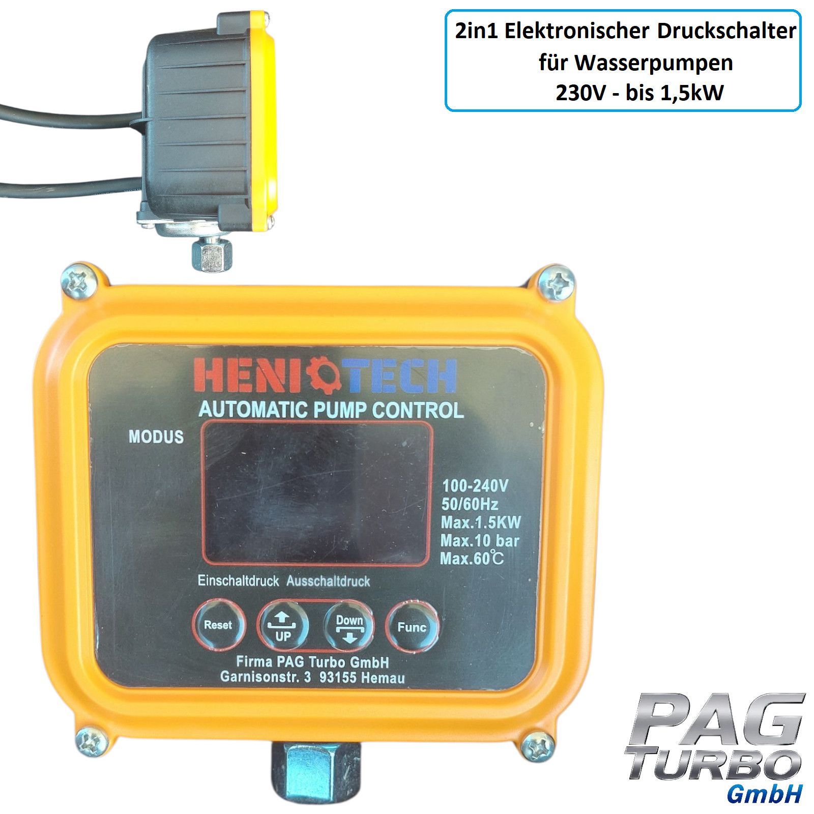 2in1 Elektronischer Druckschalter + Trockenlaufschutz für Pumpen 230V bis 1,5kW