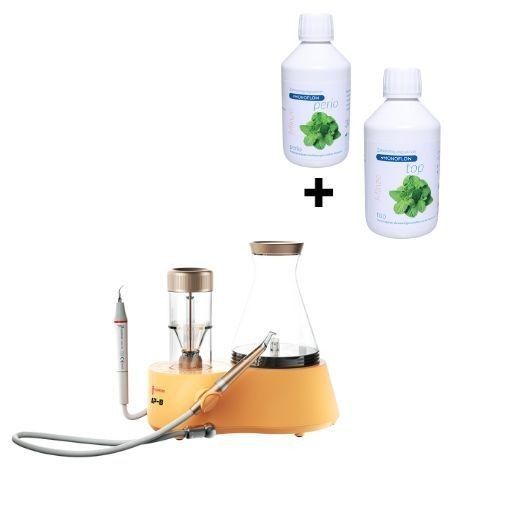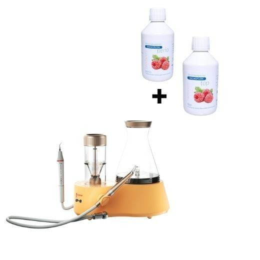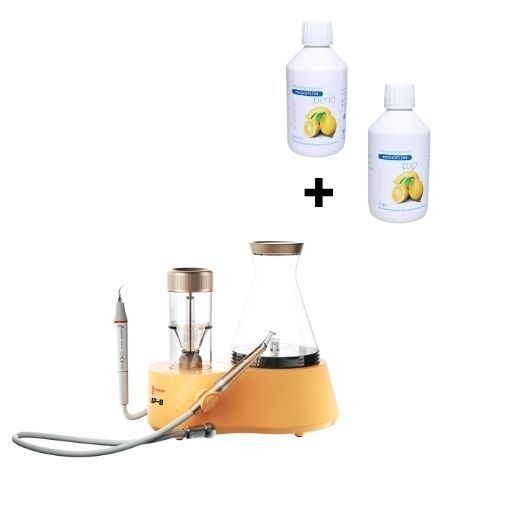 AP-B Kombi Gerät Ultraschall-Pulverstrahlgerät + Pulver Himbeere Der AP-B ist die perfekte Kombination aus einem Scaler und einem Pulverstrahlgerät. Der Arbeitsmodus, sowie Wasser und Leistung lassen sich einfach während der Behandlung entsprechend dem benötigten Handstück wechseln. Das Gerät eignet