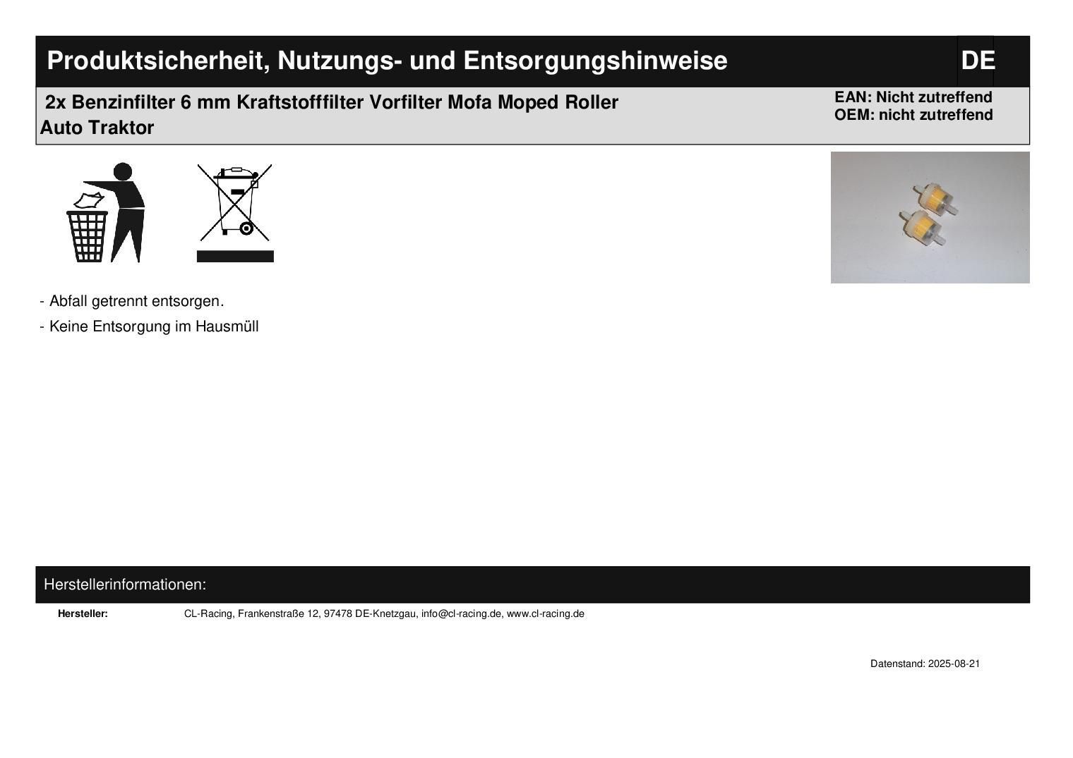 2x Benzinfilter 6 mm Kraftstofffilter Vorfilter Mofa Moped Roller Auto Traktor