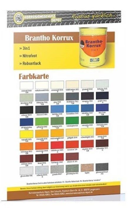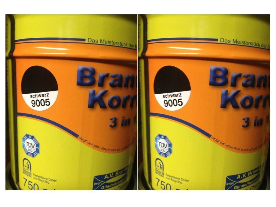 Normal 0 21 false false false DE X-NONE X-NONE MicrosoftInternetExplorer4 Brantho-Korrux 3in1 – Farbton schwarz RAL 9005 Rostschutzfarbe - Metallschutzfarbe - Instandhaltungsfarbe Lieferumfang: 2x 750ml Brantho-Korrux 3 in 1 ist ein seidenglänzender Einkomponenten-Beschichtungsstoff mit sehr hoher H