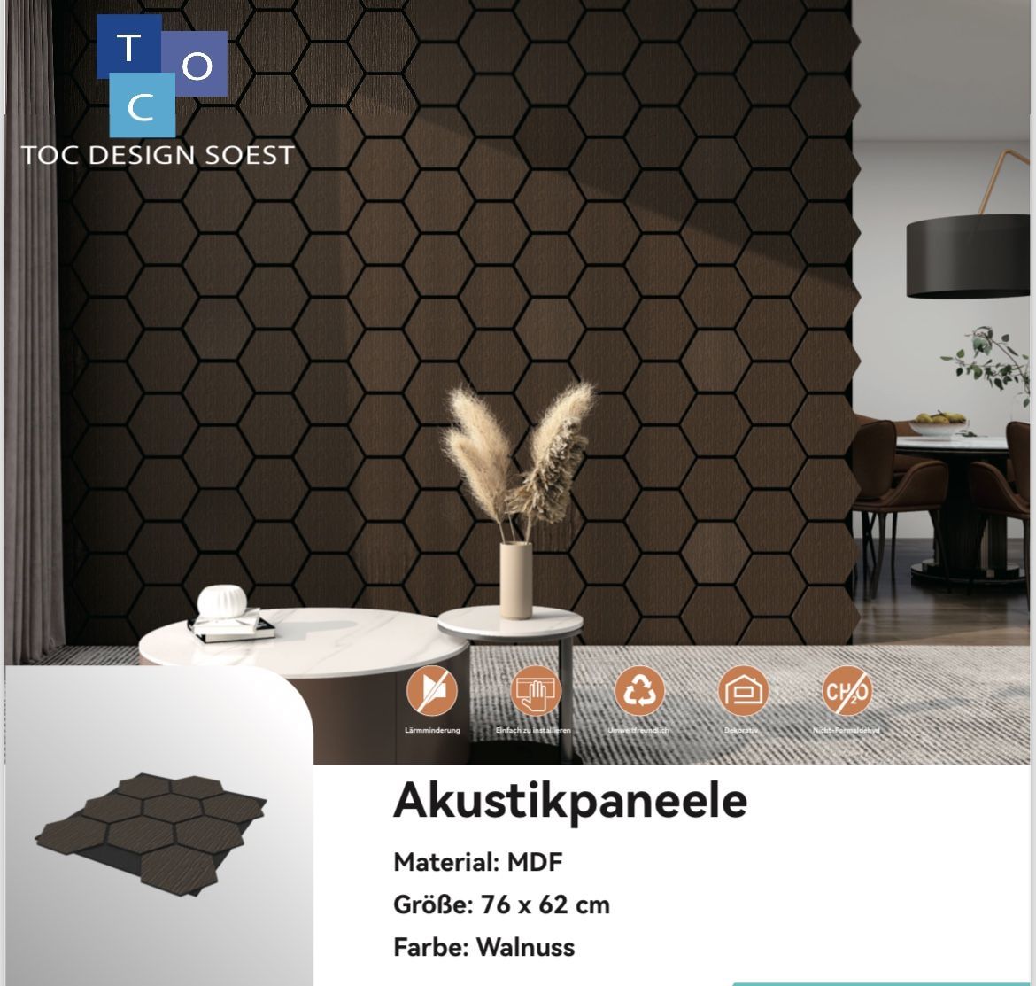 Premium Hexagon Akustik Wandpaneele Vorteile Lärmminderung Einfach zu montieren Umweltfreundlich Dekorativ Formaldehydfrei Inhalt: 2 Stück Karton Maße: Länge 76cm Breite 57cm Dicke 1,8cm Farbe: Walnuss