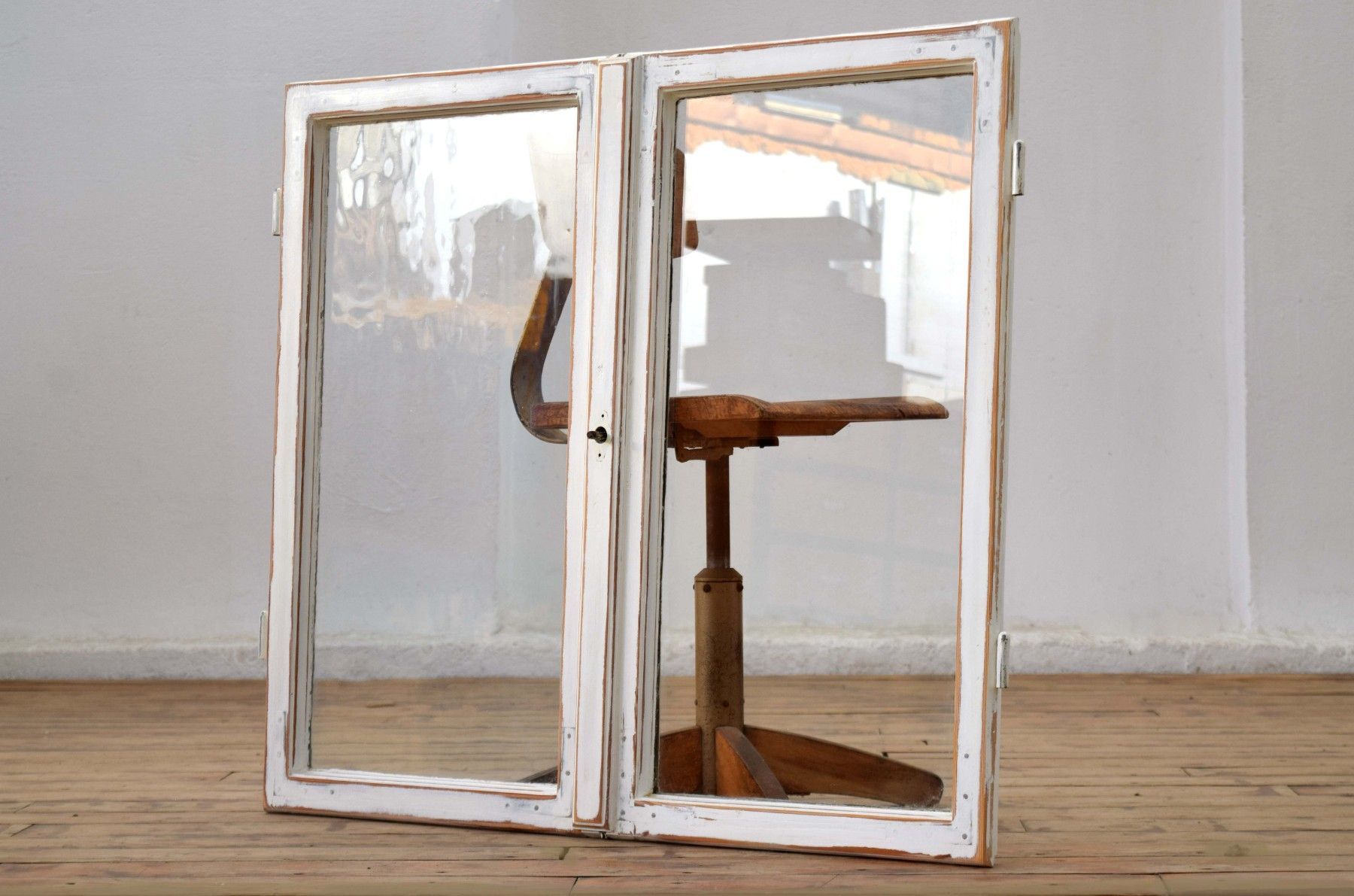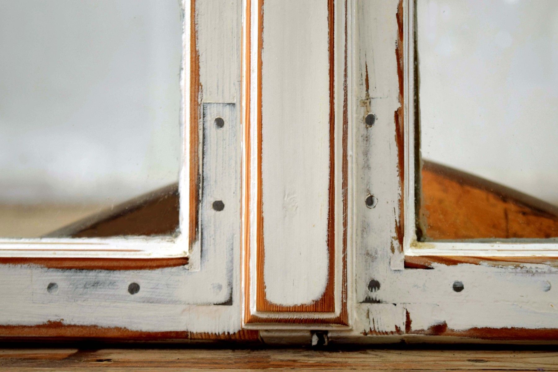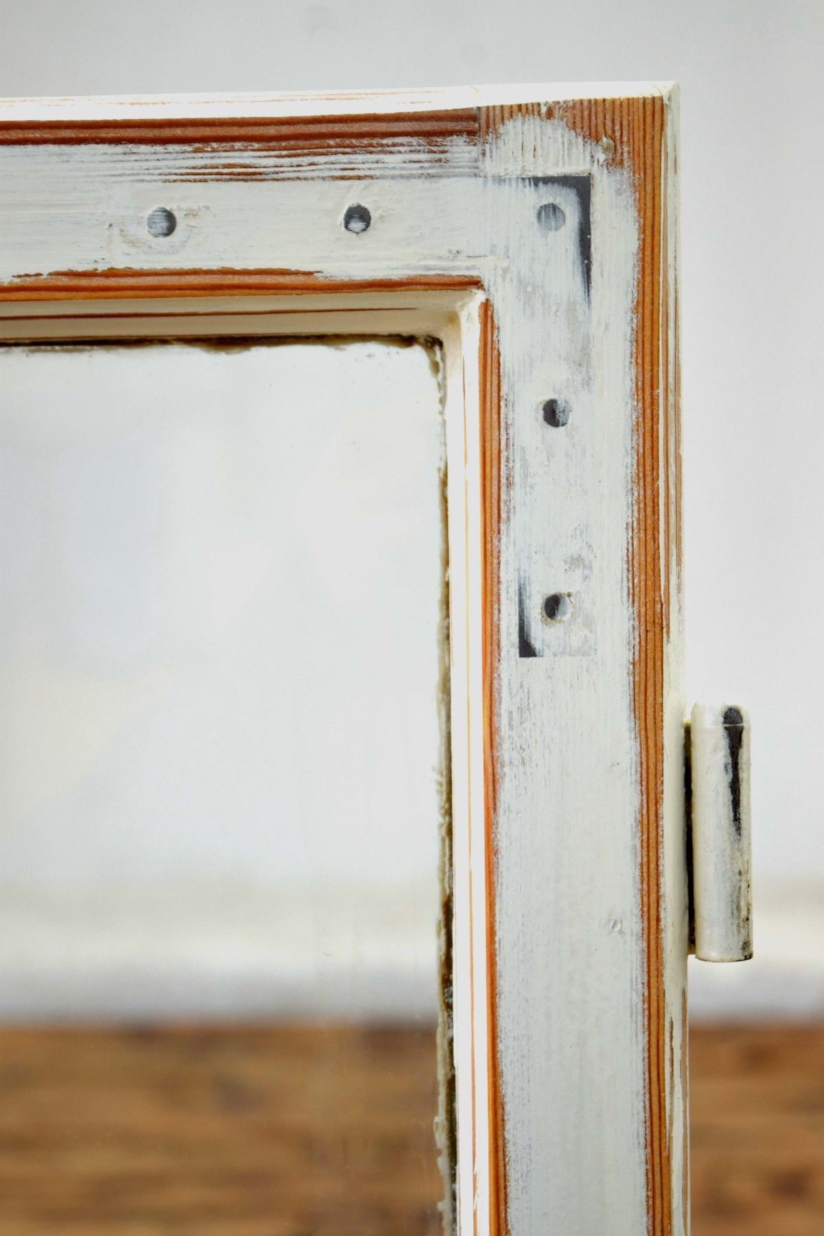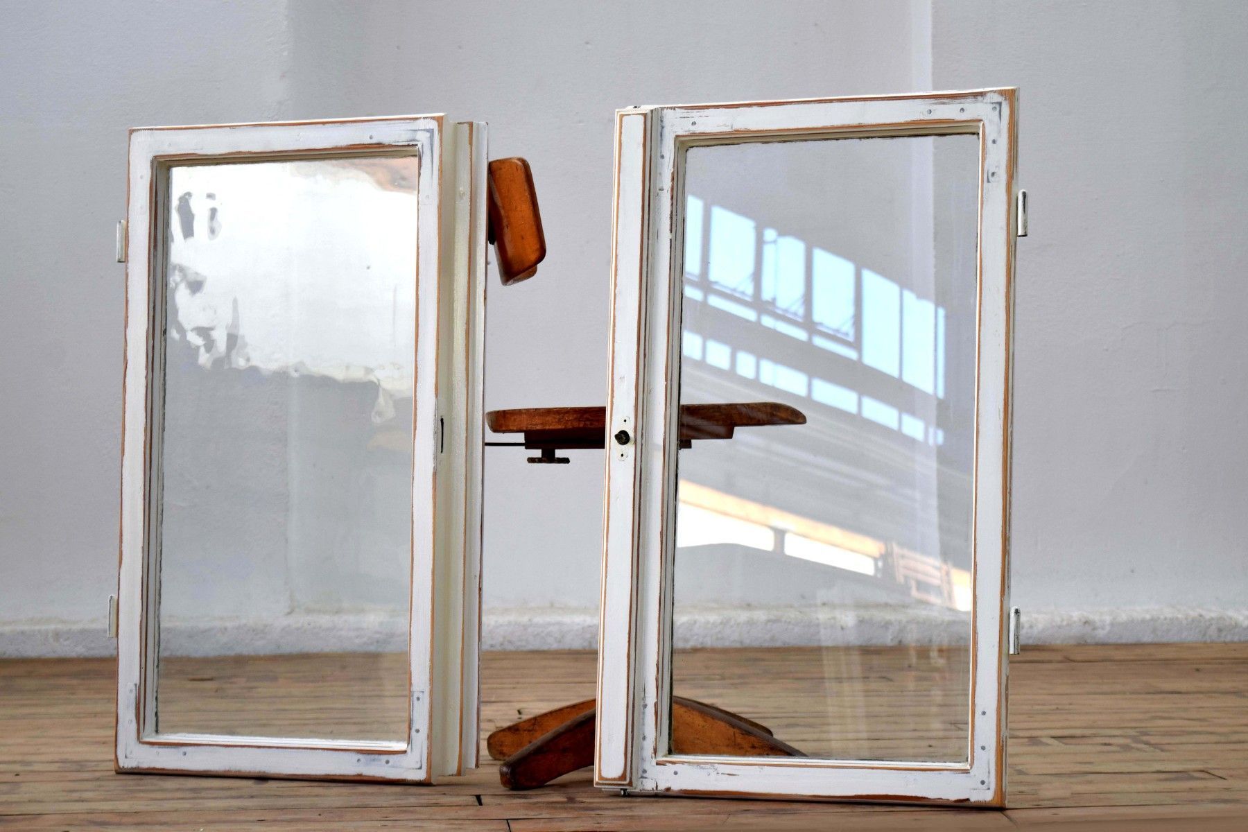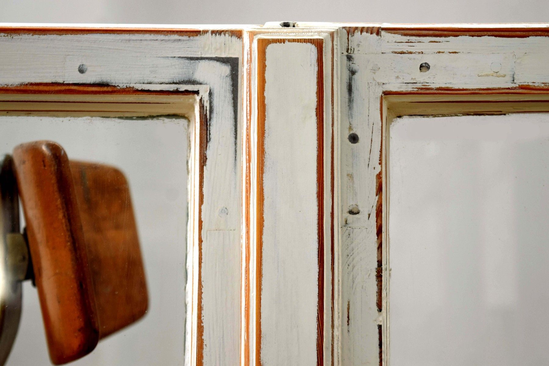 ein Paar (zwei Stück) historische Fensterflügel (um 1950) aus dickem Vollholz und Metall, heller Farbauftrag mit Shabby-Schliff mit Gebrauchspuren, schöner Zustand mit Scheiben aus Echtglas Maße je Flügel: Höhe 89cm, Breite 52cm, Tiefe 6cm, Gesamtbreite: 100cm kombiniert verwendbar (rechter und linker Flügel passen zueinander)