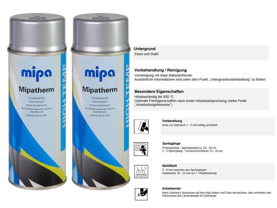 MIPA 2x Mipa Mipatherm Spray silber 400ml bis 800°C Thermolack Auspuff Motorlack