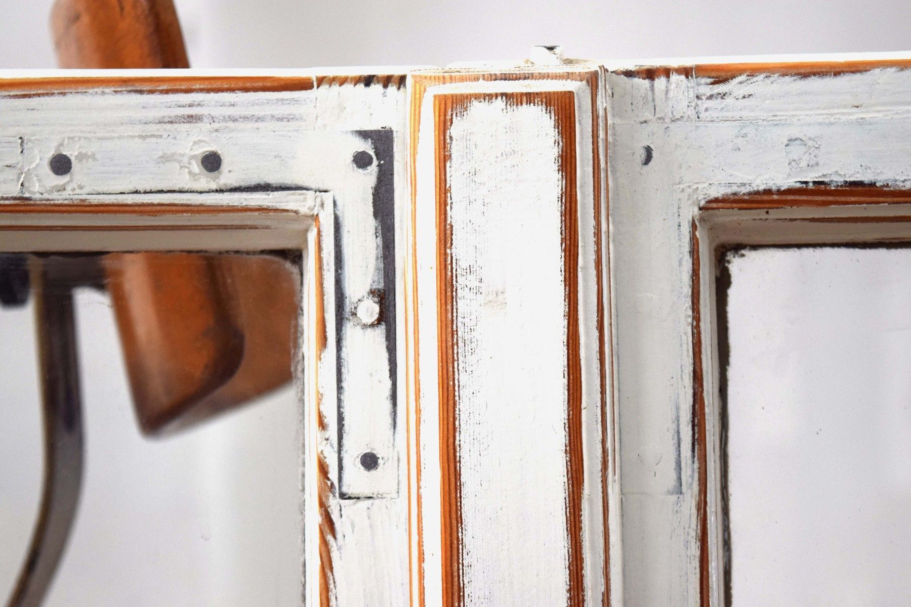 ein Paar (zwei Stück) historische Fensterflügel (um 1950) aus dickem Vollholz und Metall, heller Farbauftrag mit Shabby-Schliff mit Gebrauchspuren, schöner Zustand mit Scheiben aus Echtglas Maße je Flügel: Höhe 89cm, Breite 47cm, Tiefe 6cm, Gesamtbreite: 92cm kombiniert verwendbar (rechter und linker Flügel passen zueinander) Der Versand innerhalb Deutschlands ist kostenfrei und erfolgt per DHL Paket. Verkaufsgegenstand sind die beiden Fensterfügel als Paar.