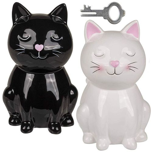 2x Tier Spardose Katzen schwarz + weiß mit Schloss 15,5 cm Sparbüchse Kätzchen