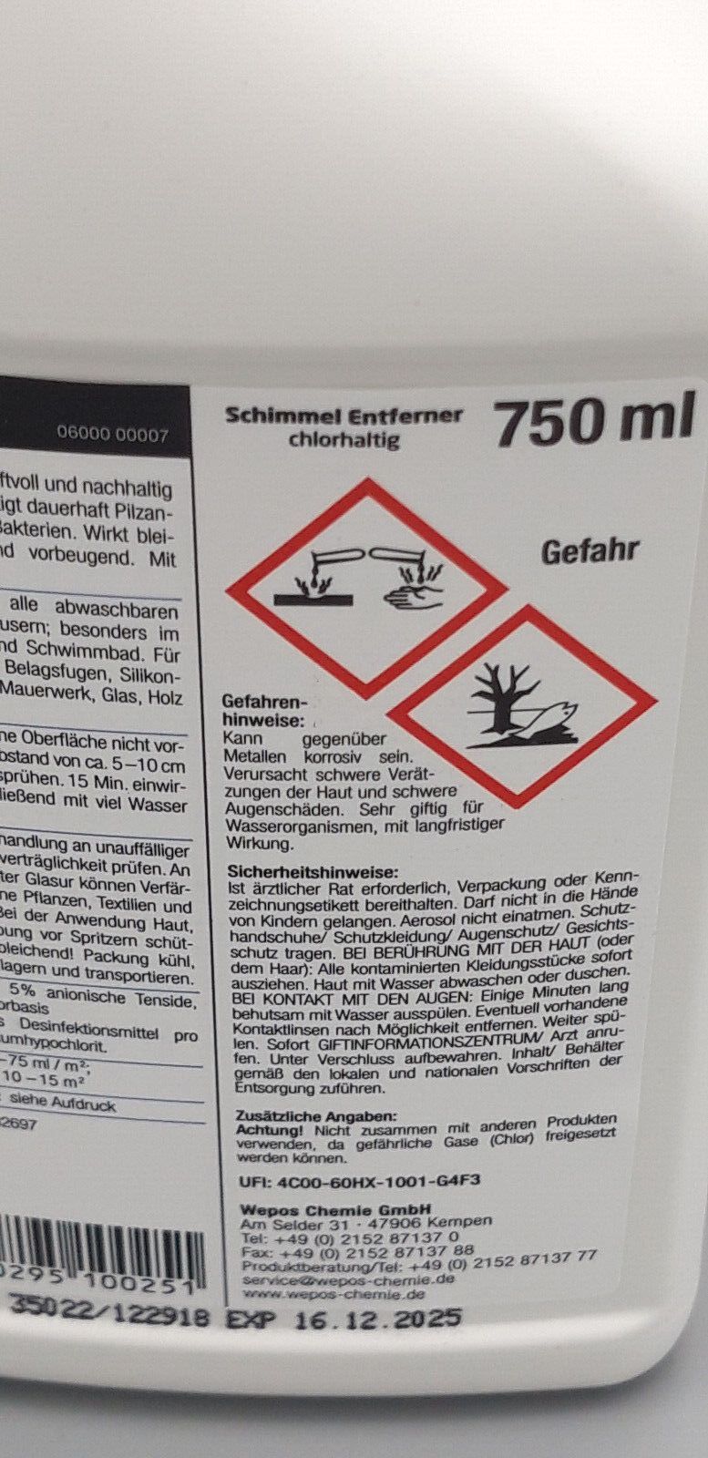 2x Wepos Schimmel Entferner Spray chlorhaltig 750ml Anti Schimmel Spray
