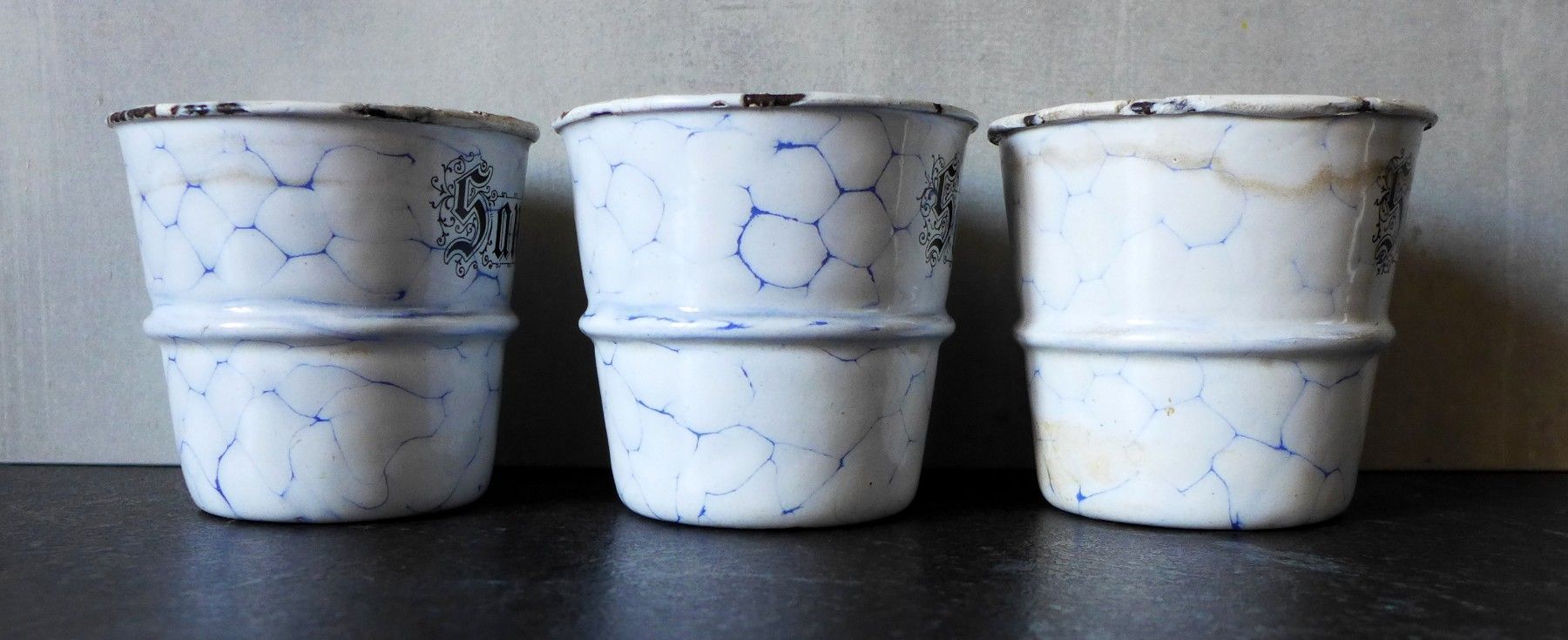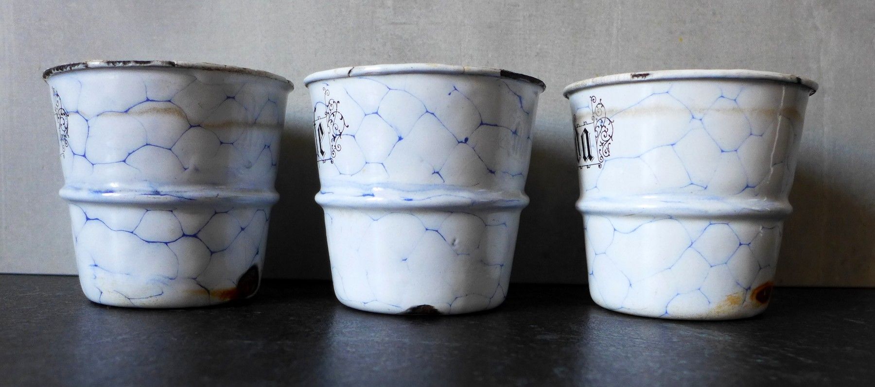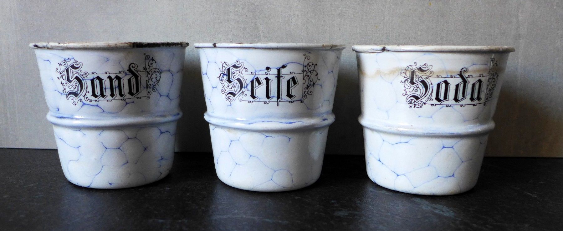 3 alte Emaille Sand Seife Soda Wabenmuster Netzmuster