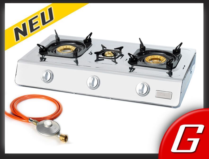 3 flammiger Propan Outdoor Gaskocher Wokbrenner mit Edelstahl-Gehäuse, Zündsicherung und Piezozünder neuster Generation . + Gasschlauch 1,5 m und Druckminderer Der Gaskocher kann ohne kostspielige Umrüstung für 30 mbar und 50 mbar Gasdruck verwendet werden. Durch die hohe Leistung, ist der Gaskocher