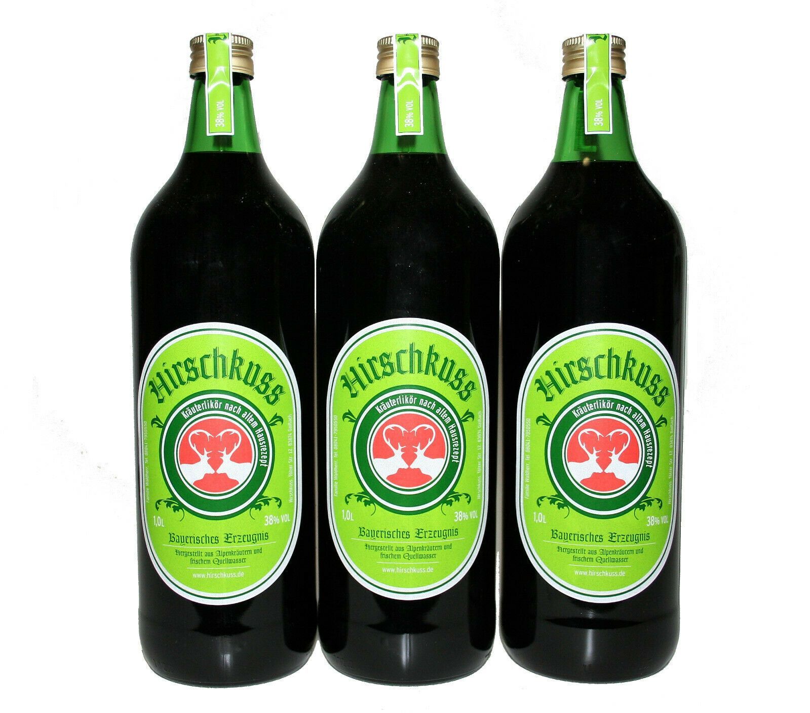 3 Flaschen Hirschkuss Kräuterlikör 38% Vol. 1 l Liter